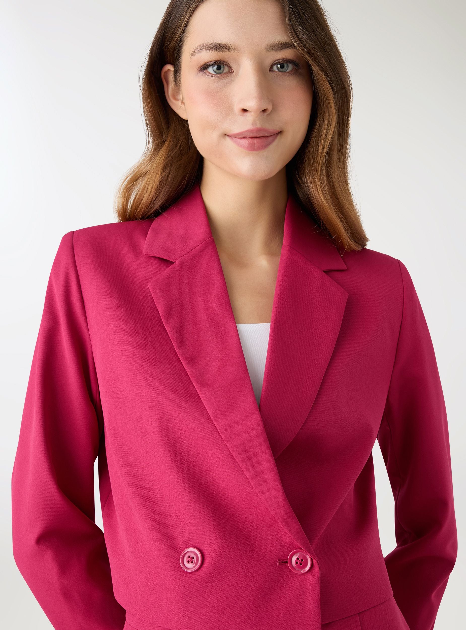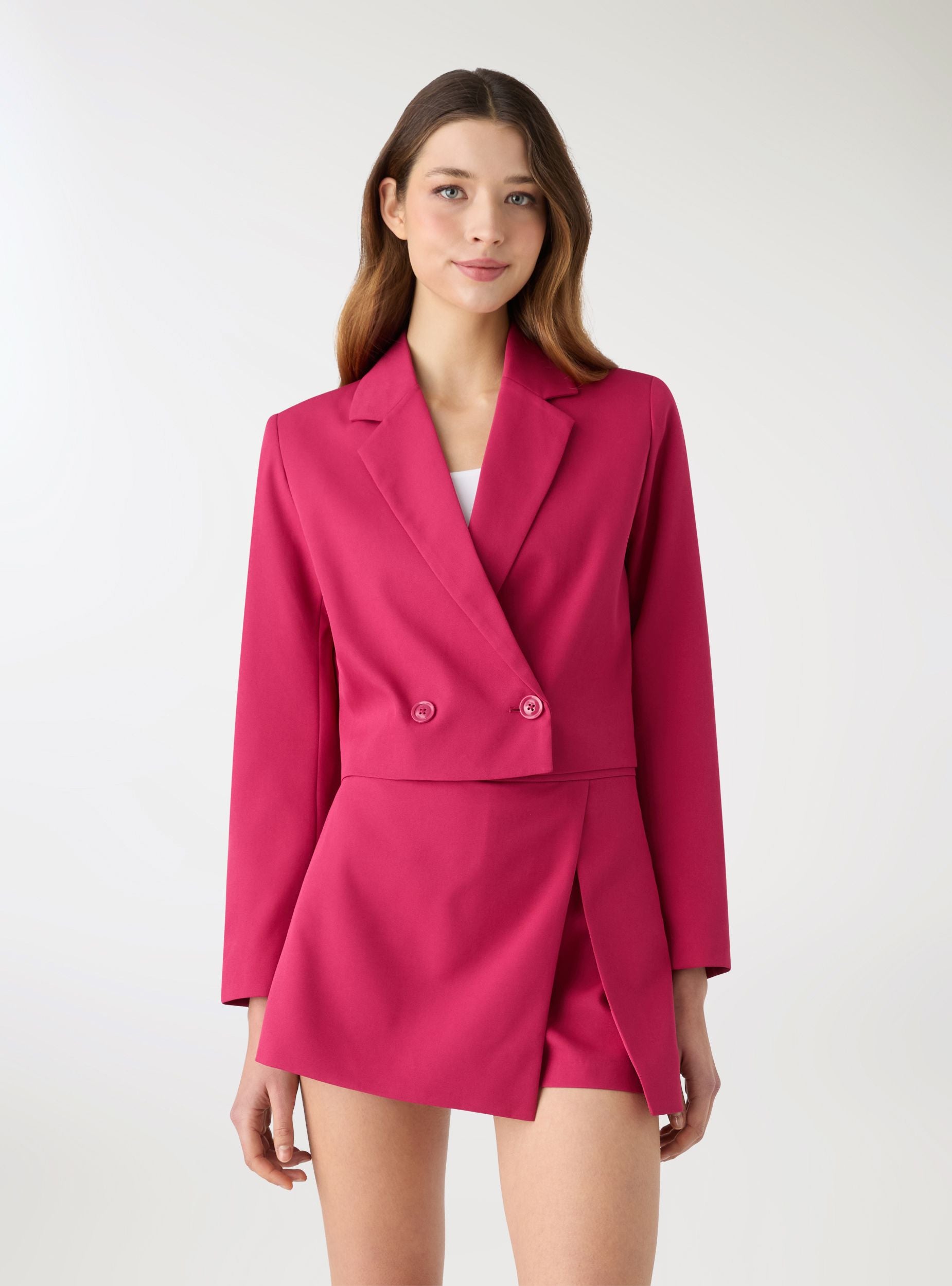 Giacca da donna crop a tinta unita con revers a lancia e chiusura doppiopetto. La linea corta scolpisce il punto vita. Ideale da mattina a sera, su jeans a vita alta per un look urbano o con pantaloni sartoriali e décolleté per l’ufficio e gli eventi. Maniche lunghe, interno foderato e costruzione pulita. Due bottoni frontali e taglio posteriore leggermente stondato per una vestibilità moderna e femminile.Dettagli