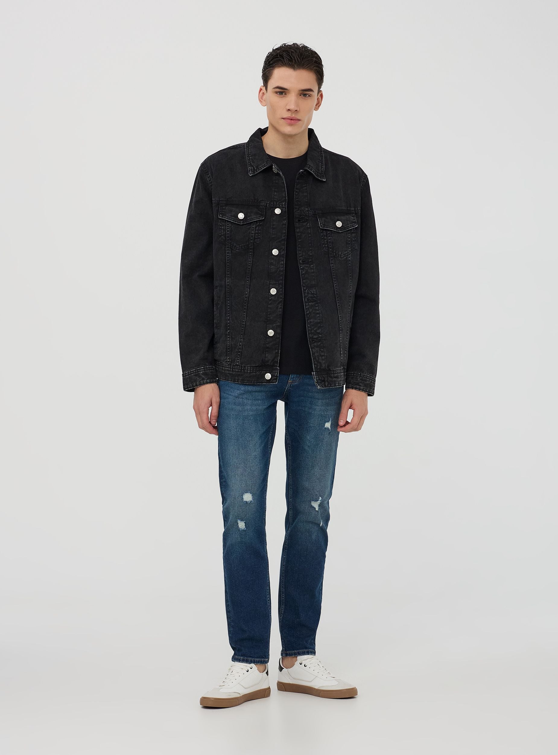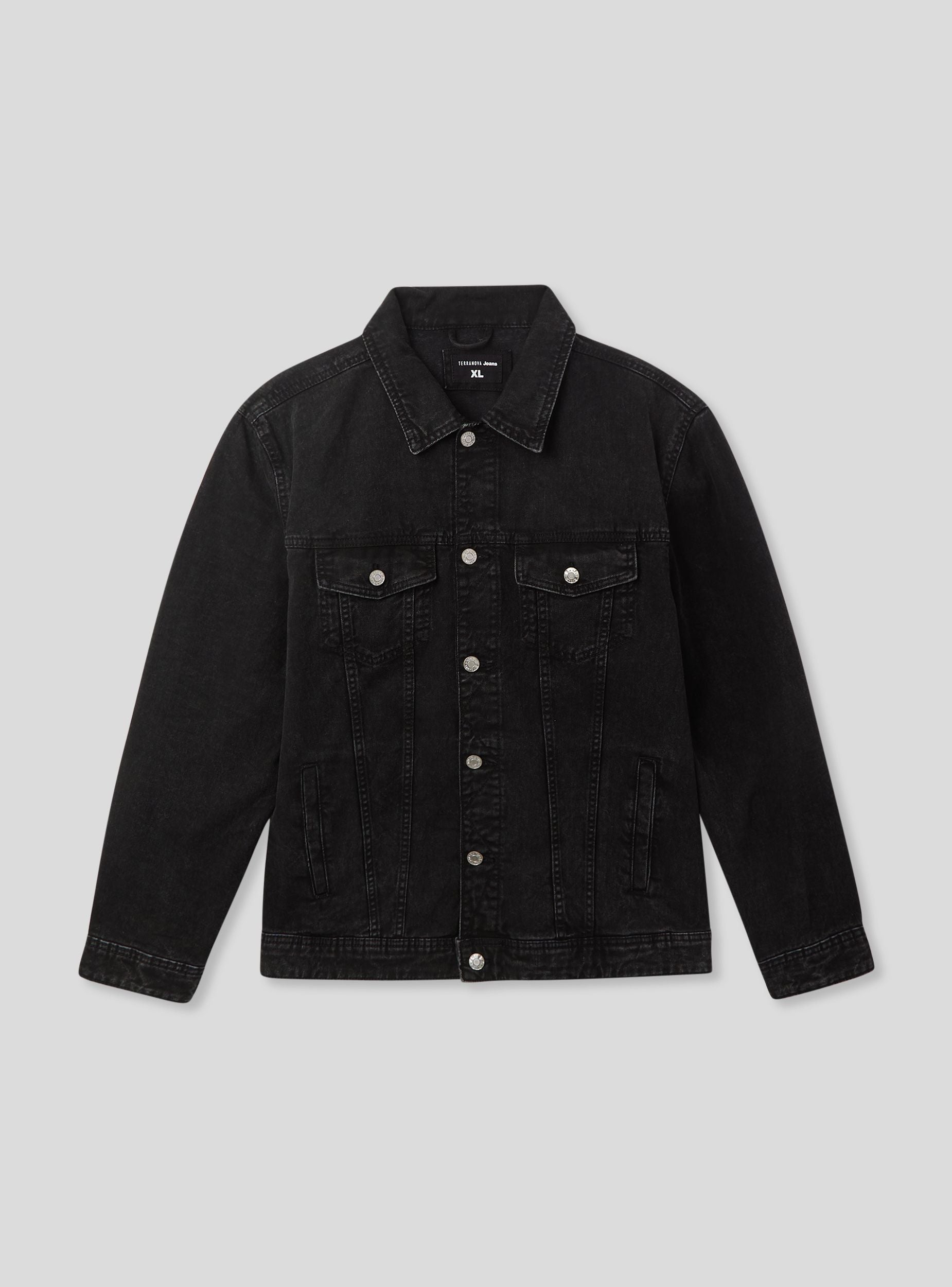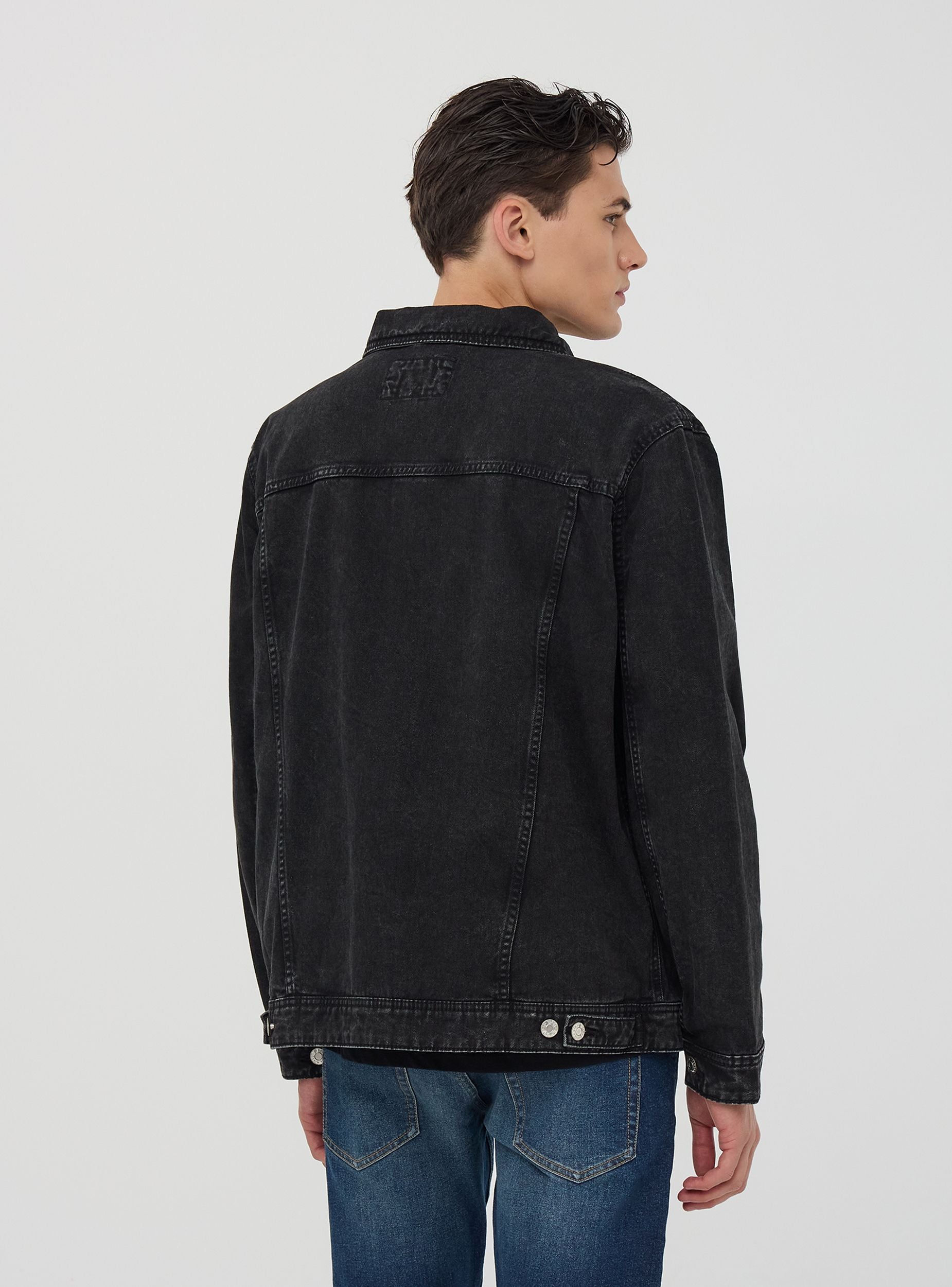 Giubbino da uomo in denim nero, perfetto per un look urbano e di tendenza. Caratterizzato da una tinta unita, maniche lunghe e bottoni, presenta tasche sul petto e laterali per praticità. Ideale per il tempo libero, si abbina facilmente a jeans chiari o pantaloni cargo, creando outfit versatili e moderni per ogni occasione casual.