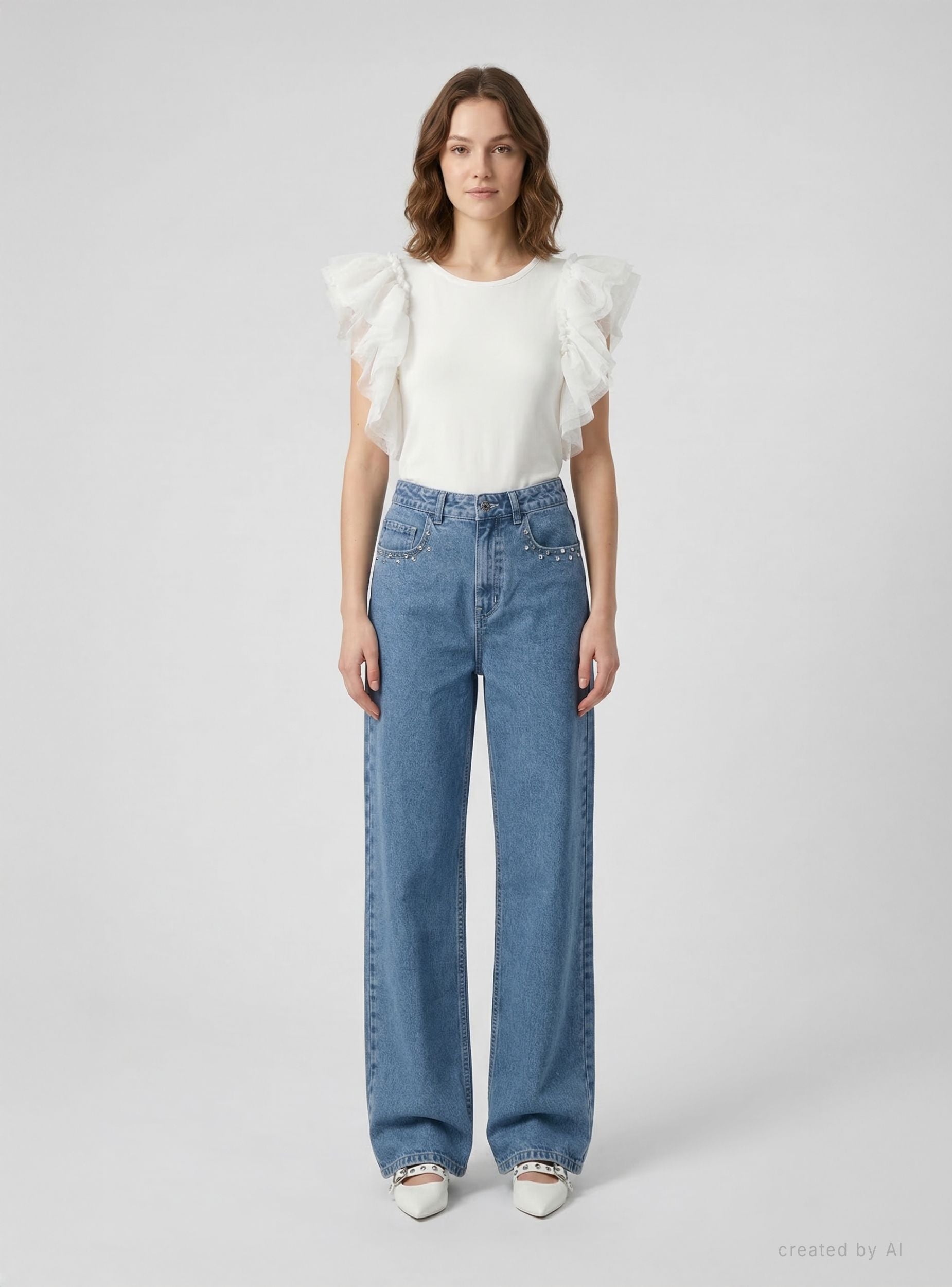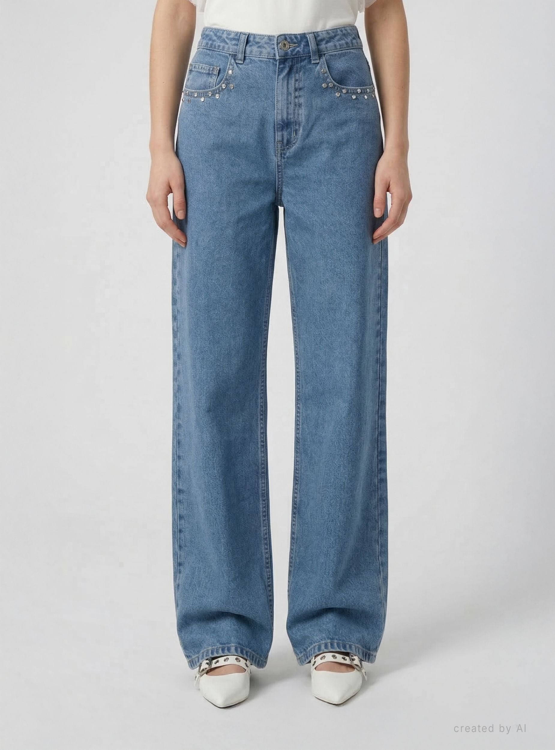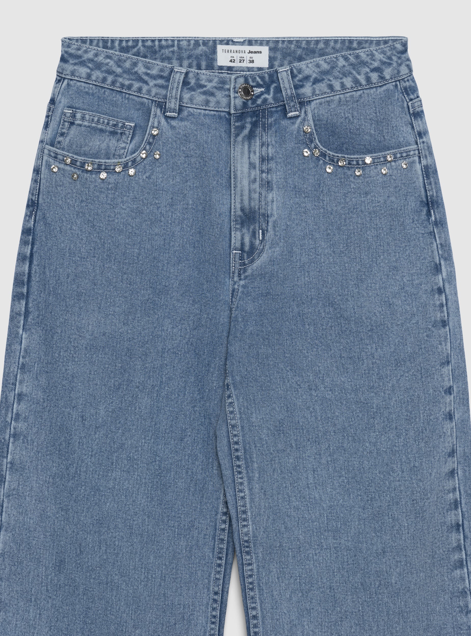 Jeans da donna a gamba ampia, tinta unita, perfetti per look casual e trendy. Modello 5 tasche con chiusura a bottone e zip, vita media e passanti per cintura. Dettaglio di strass lungo il bordo delle tasche frontali che illumina l’outfit. Lunghezza lunga fino alla caviglia, ideale con maglietta e sneakers o con camicia e sandali per un tocco brillante.Dettagli