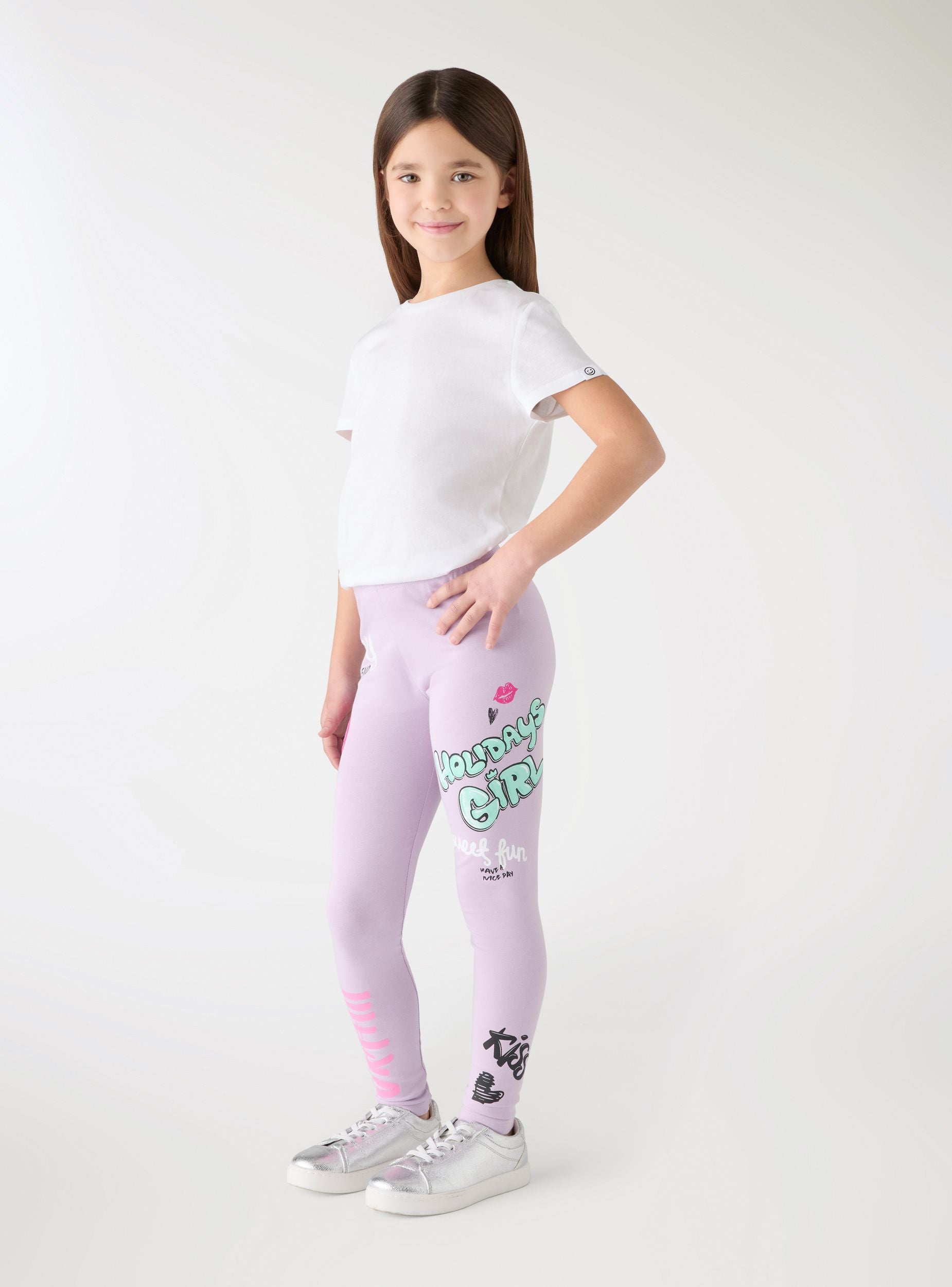 Leggings da bambina con stampa graffiti. Modello lungo con vestibilità aderente e vita elasticizzata, ideale per scuola, tempo libero e attività quotidiane. Facili da abbinare con maglietta e felpa. Le grafiche vivaci aggiungono un tocco divertente al look.Dettagli