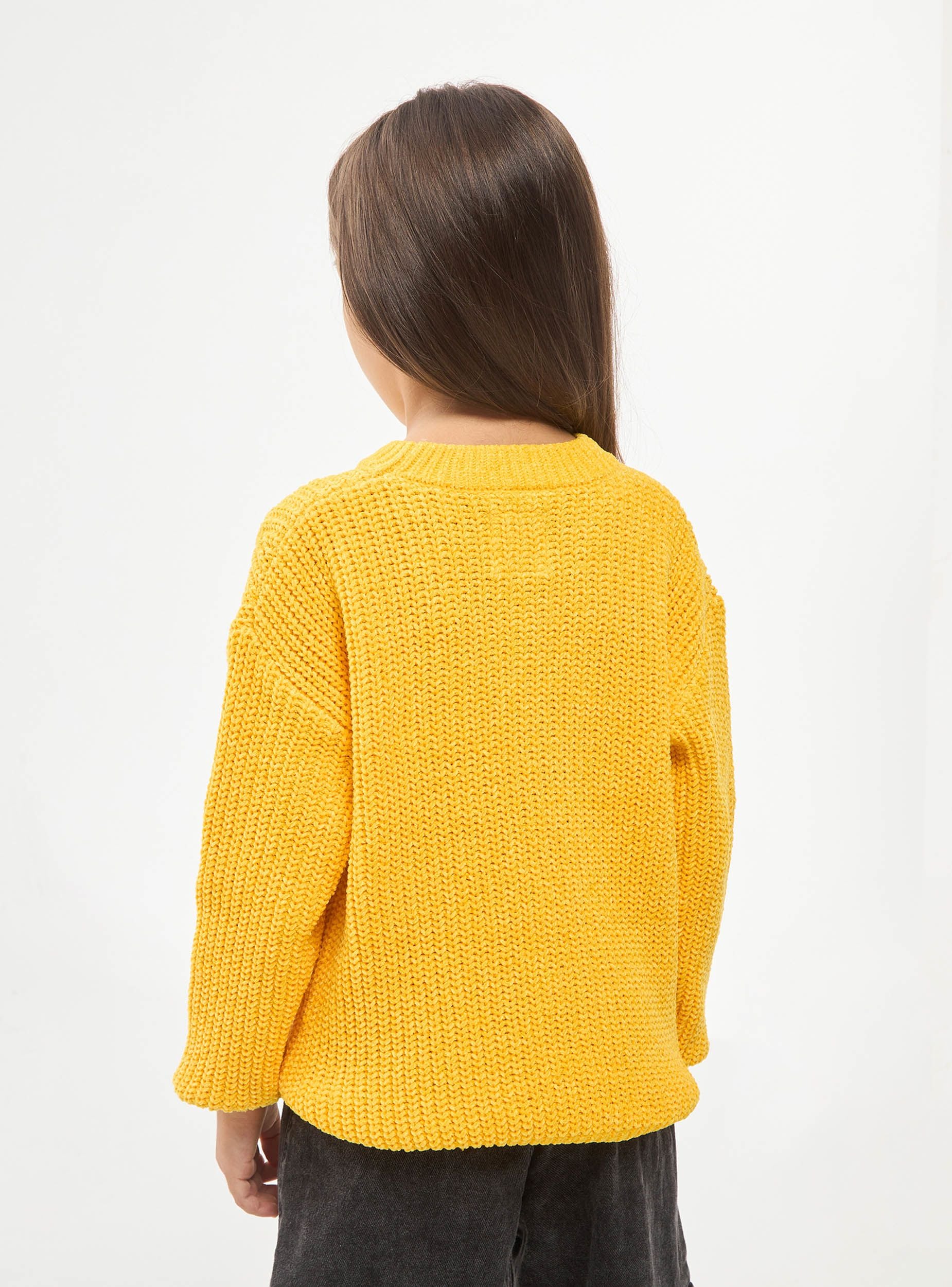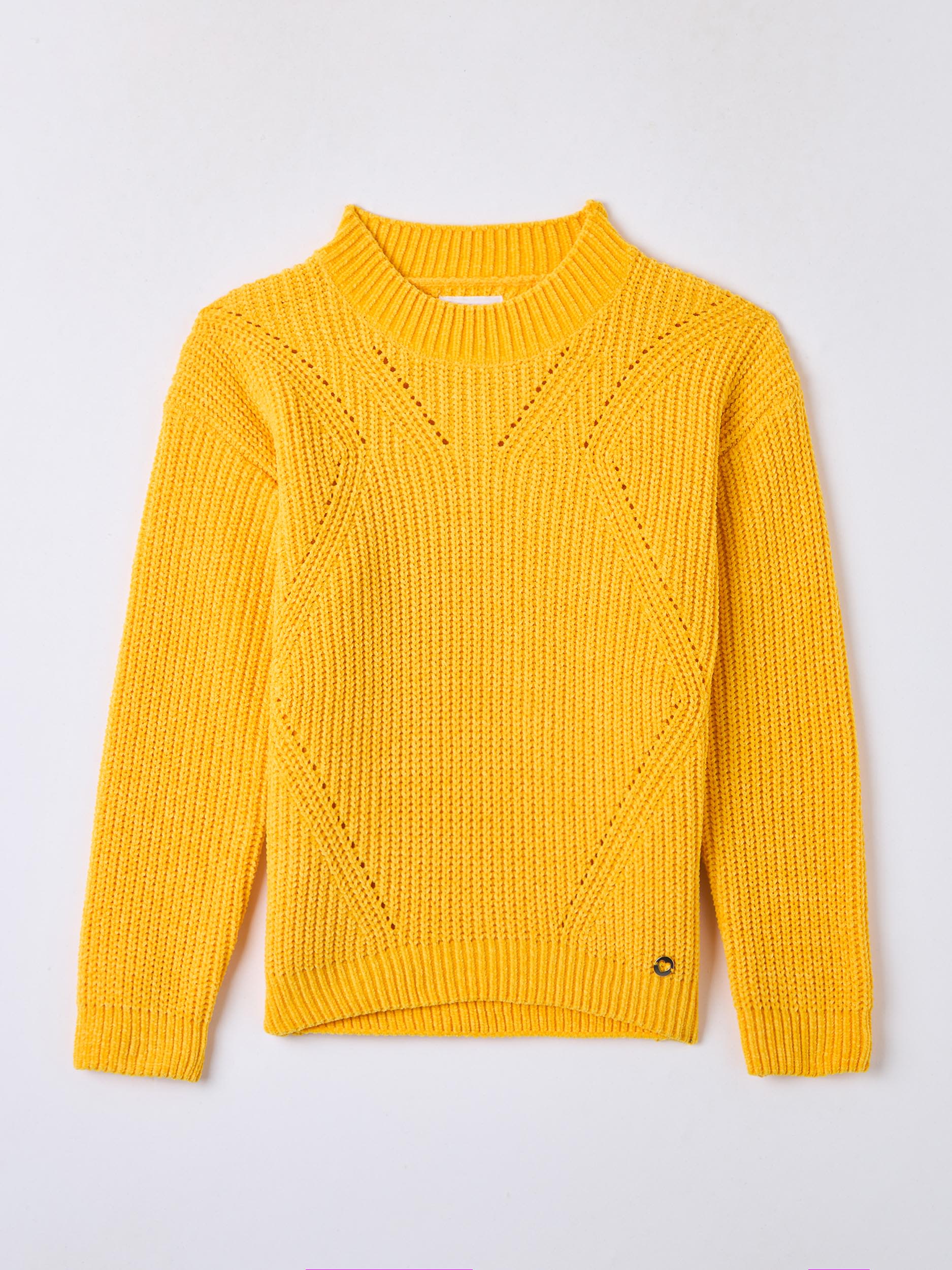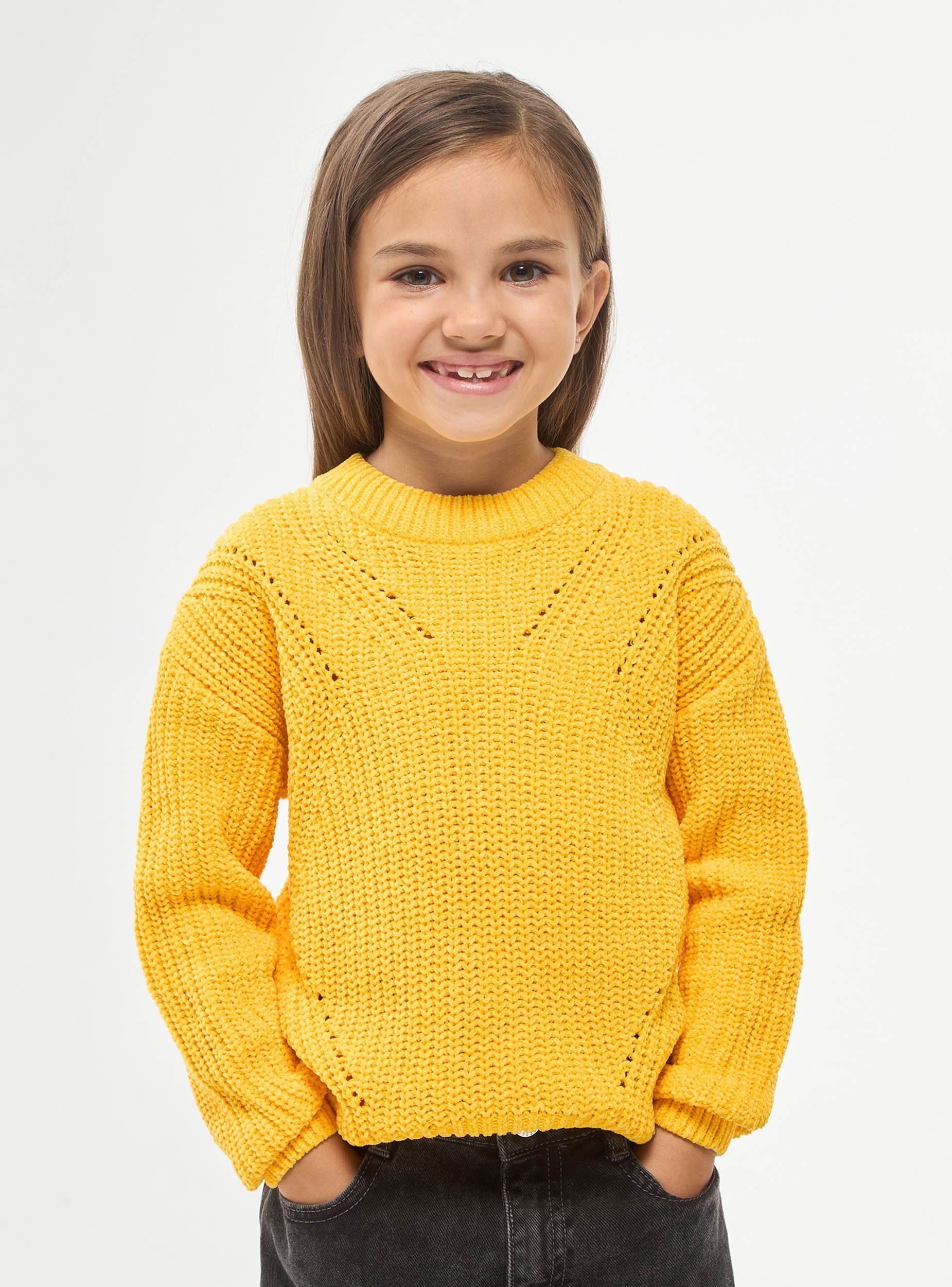 Maglia da bambina in ciniglia a tinta unita, caratterizzata da una lavorazione con finiture a costine e uno scollo rotondo. Il design è semplice e confortevole, con una vestibilità regular che permette libertà di movimento. Le maniche lunghe offrono calore e protezione, rendendo questa maglia ideale per le giornate più fresche. Il look essenziale e versatile la rende adatta a diversi abbinamenti, perfetta per un utilizzo quotidiano con stile.Dettagli