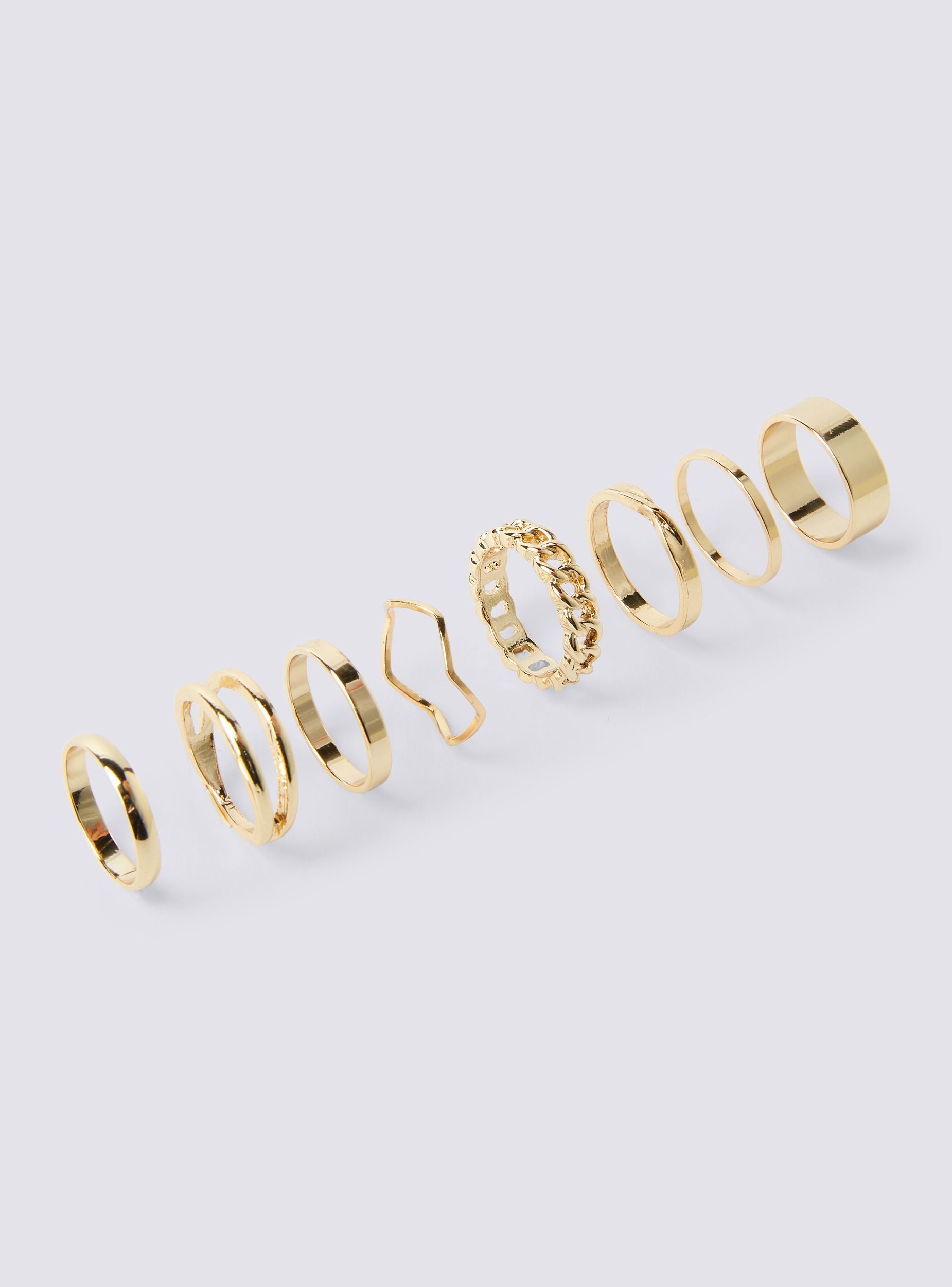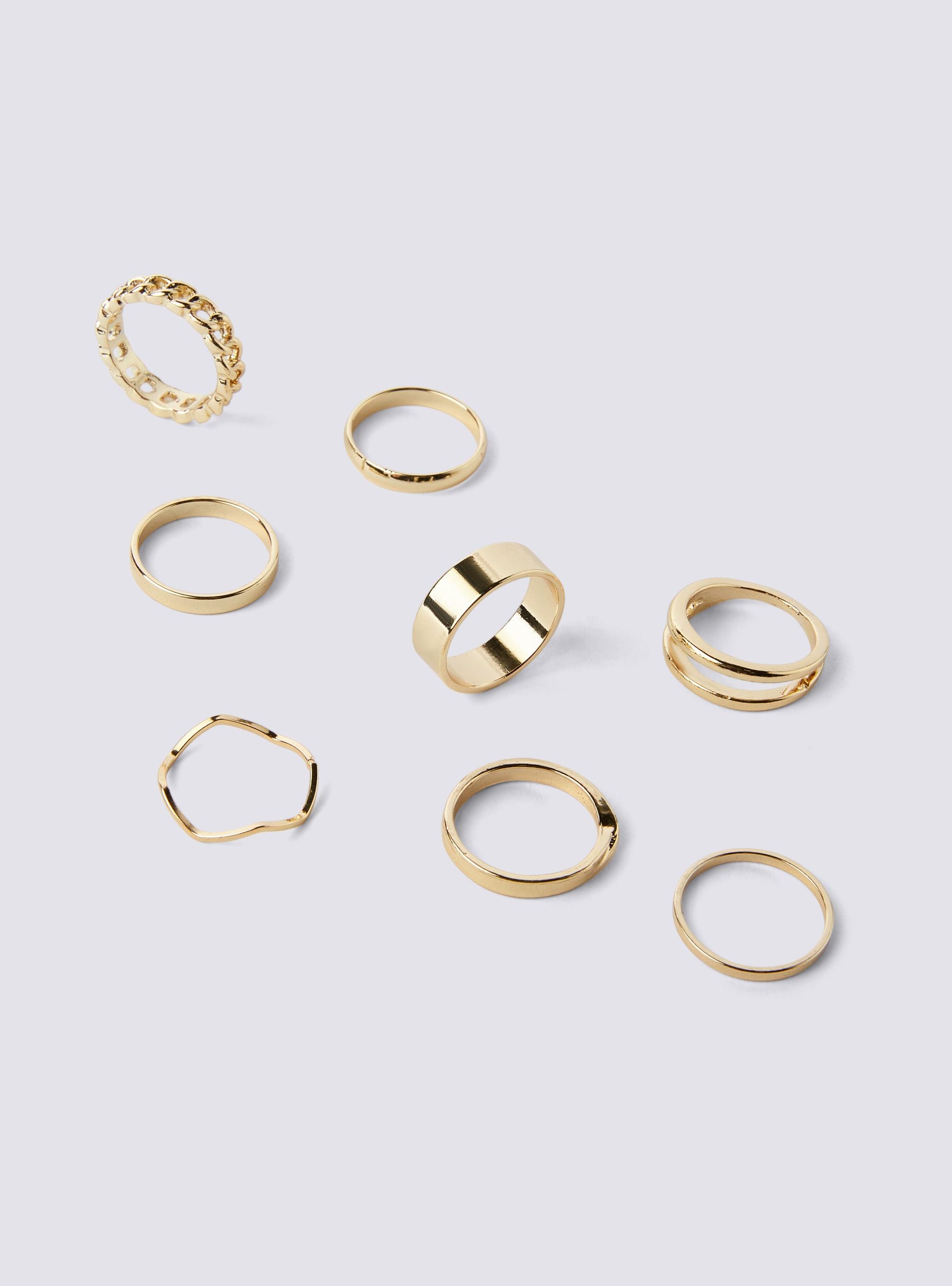 Confezione composta da 8 anelli da donna con design variegato, perfetti per chi ama giocare con gli accessori e creare combinazioni sempre diverse. Il set include modelli lisci, intrecciati e dettagliati, ideali per essere indossati singolarmente o sovrapposti per un look più originale. Un mix di forme e finiture che aggiunge un tocco di stile a ogni outfit. Nickel free.