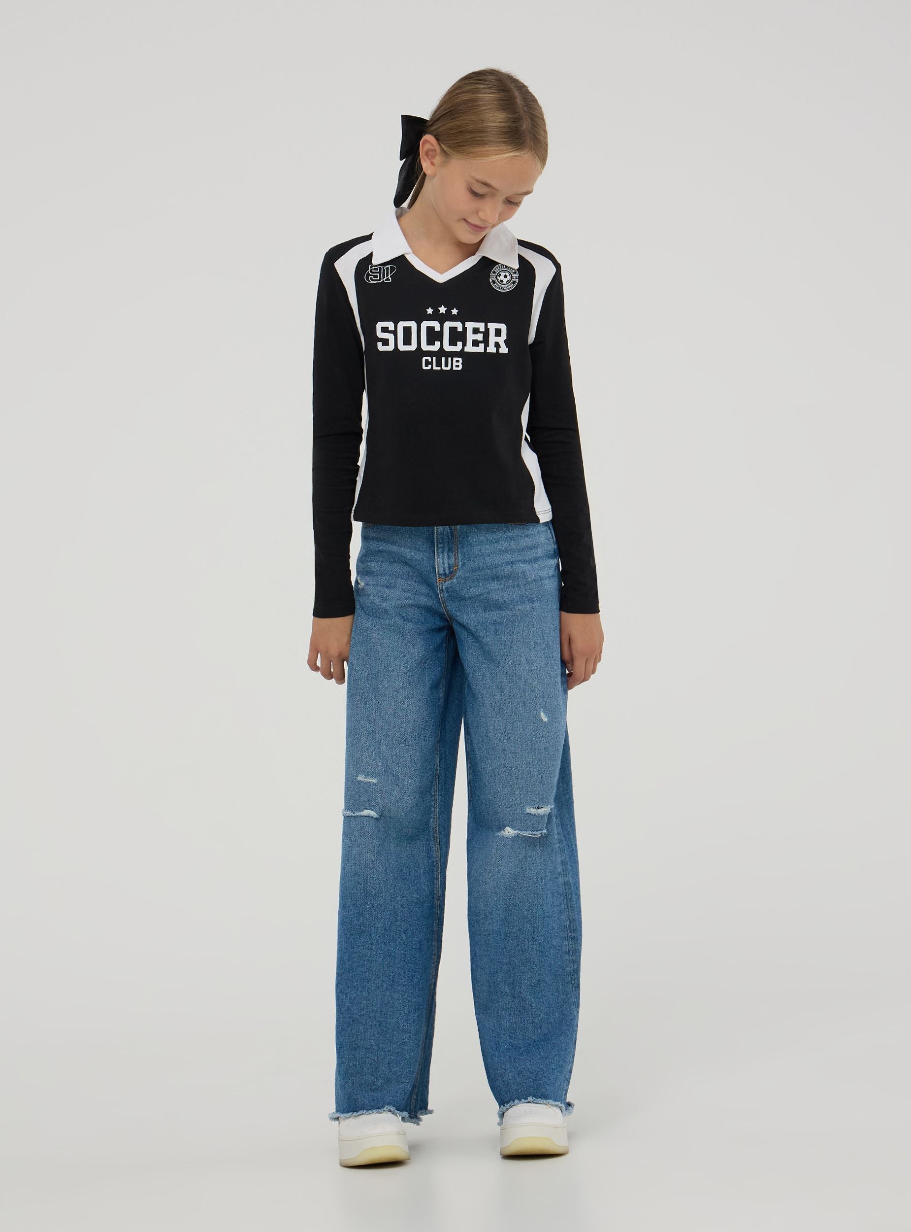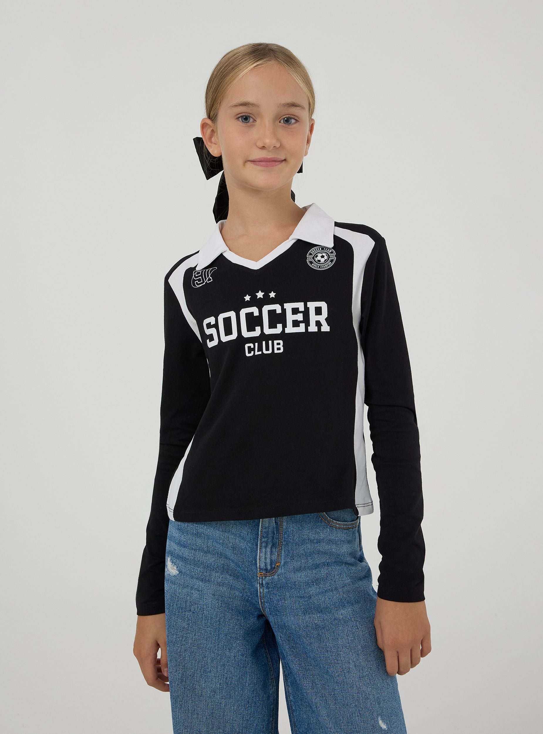 Maglia da bambina, modello polo a maniche lunghe, con design sportivo caratterizzata dalla stampa stile football frontale e dettagli a contrasto sui lati e sulle spalle. Il capo presenta un colletto classico con scollo a v. Perfetta per un look casual durante le giornate scolastiche o le uscite pomeridiane, abbinata a jeans o pantaloni sportivi.Dettagli