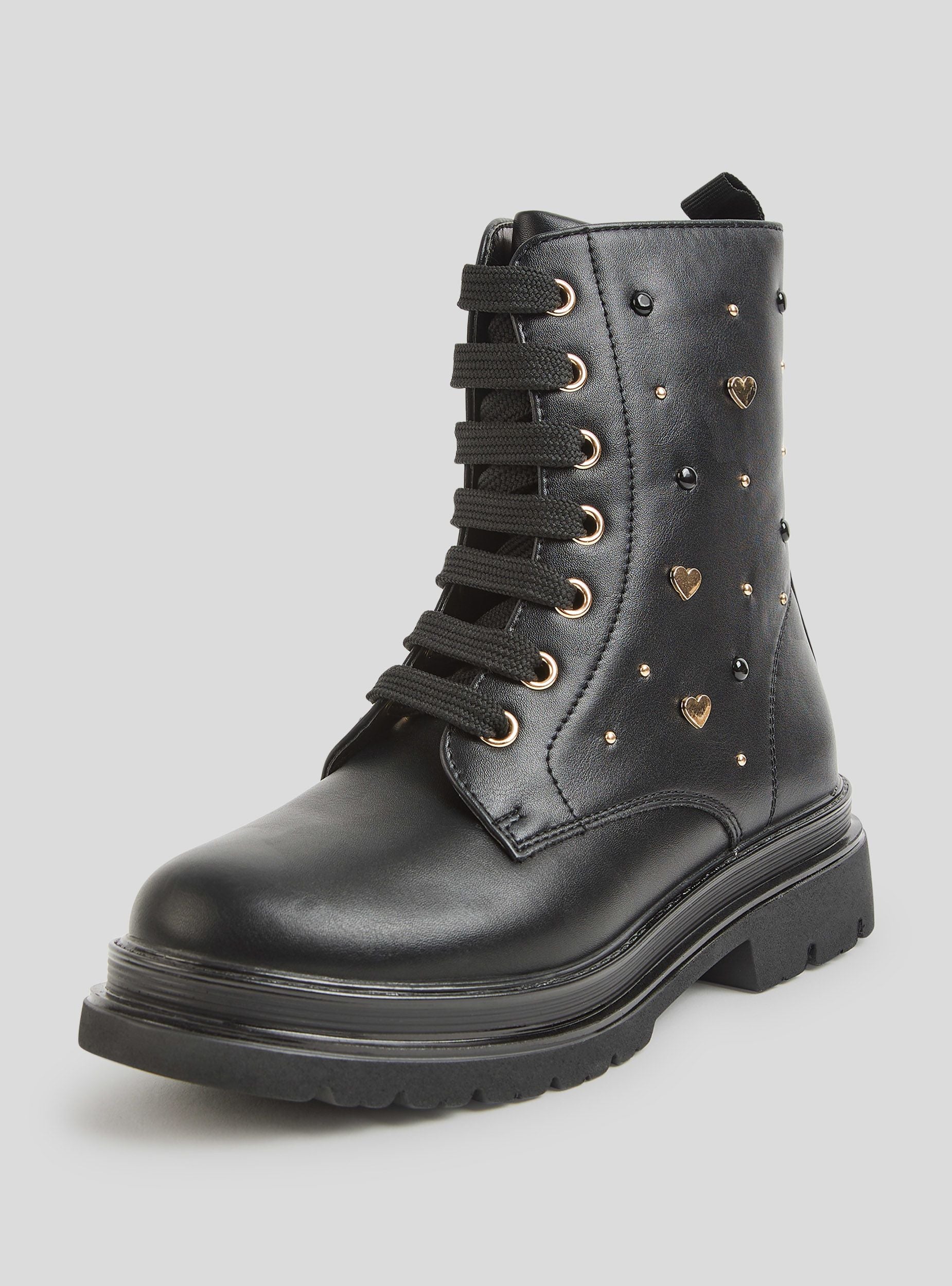 Stivaletti da bambina con chiusura frontale con lacci e laterale interna con zip. Realizzati in materiale effetto pelle sono arricchiti da borchiette a forma di pallini e cuoriccini. Perfetti per aggiungere un tocco romantico all'oufit.