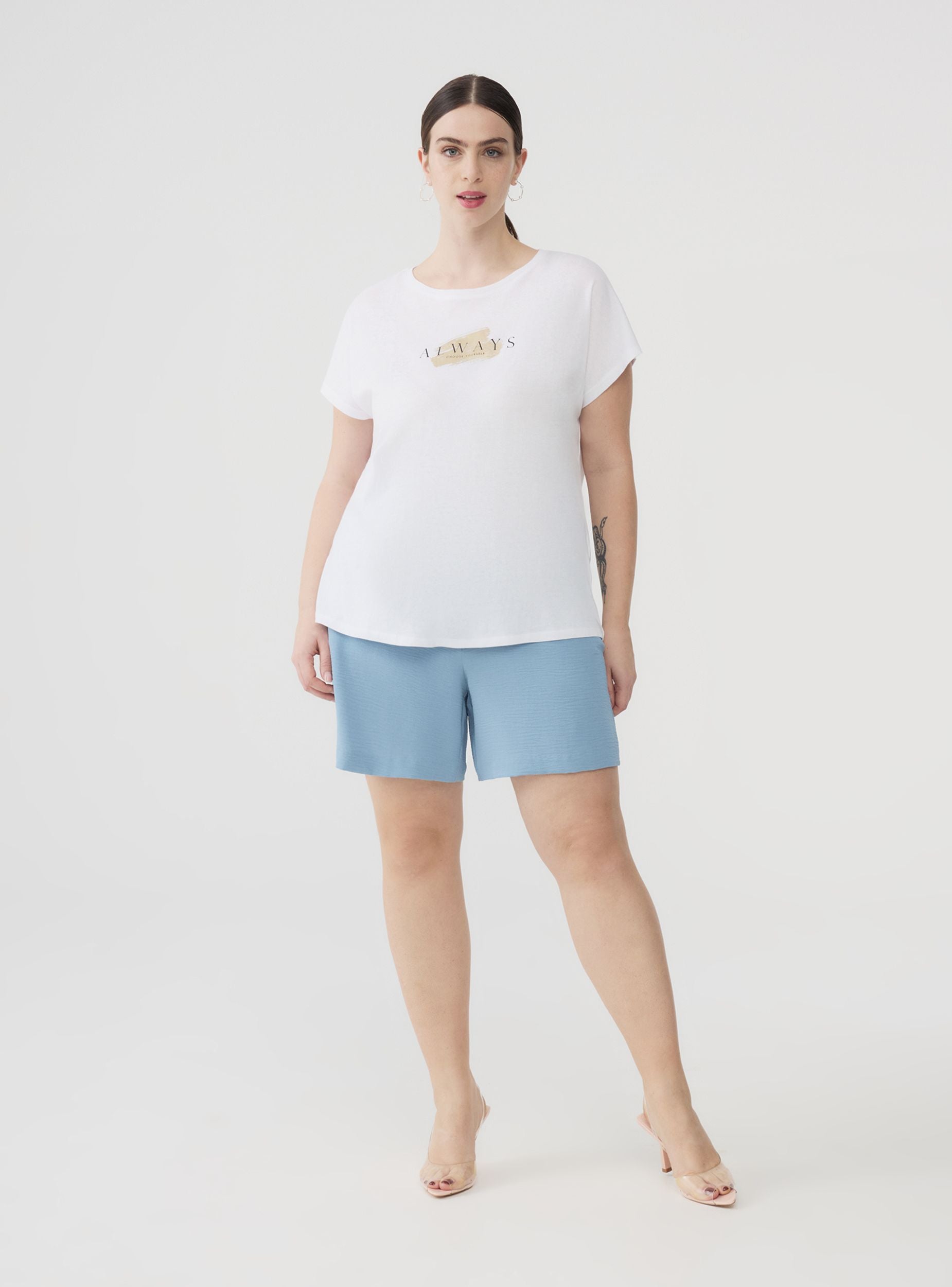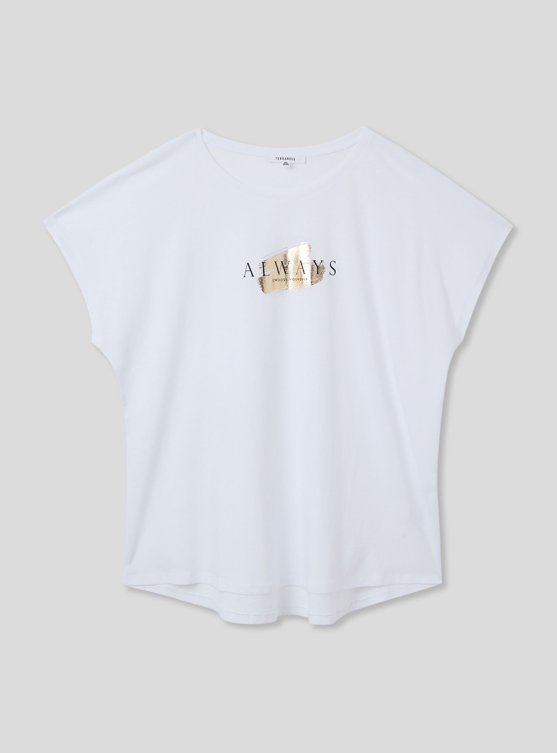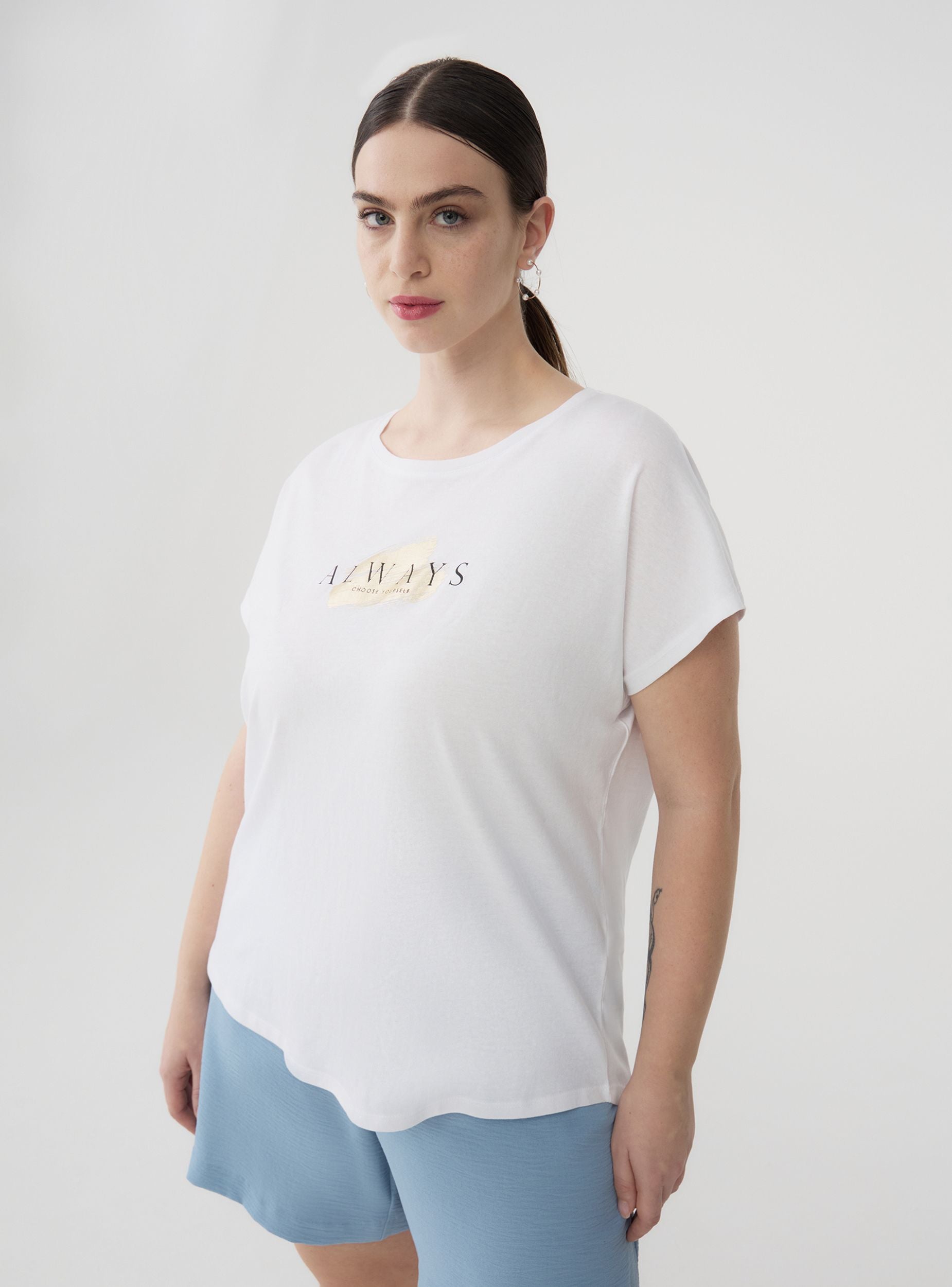 Maglietta da donna perfetta per un look casual e alla moda, ideale per le giornate informali o per aggiungere un tocco glamour agli outfit quotidiani. Caratterizzata da una stampa laminata con scritta che cattura l’attenzione, questa t-shirt con maniche corte e girocollo offre comfort e stile. Abbinala a jeans o pantaloni per un outfit versatile e moderno.Dettagli