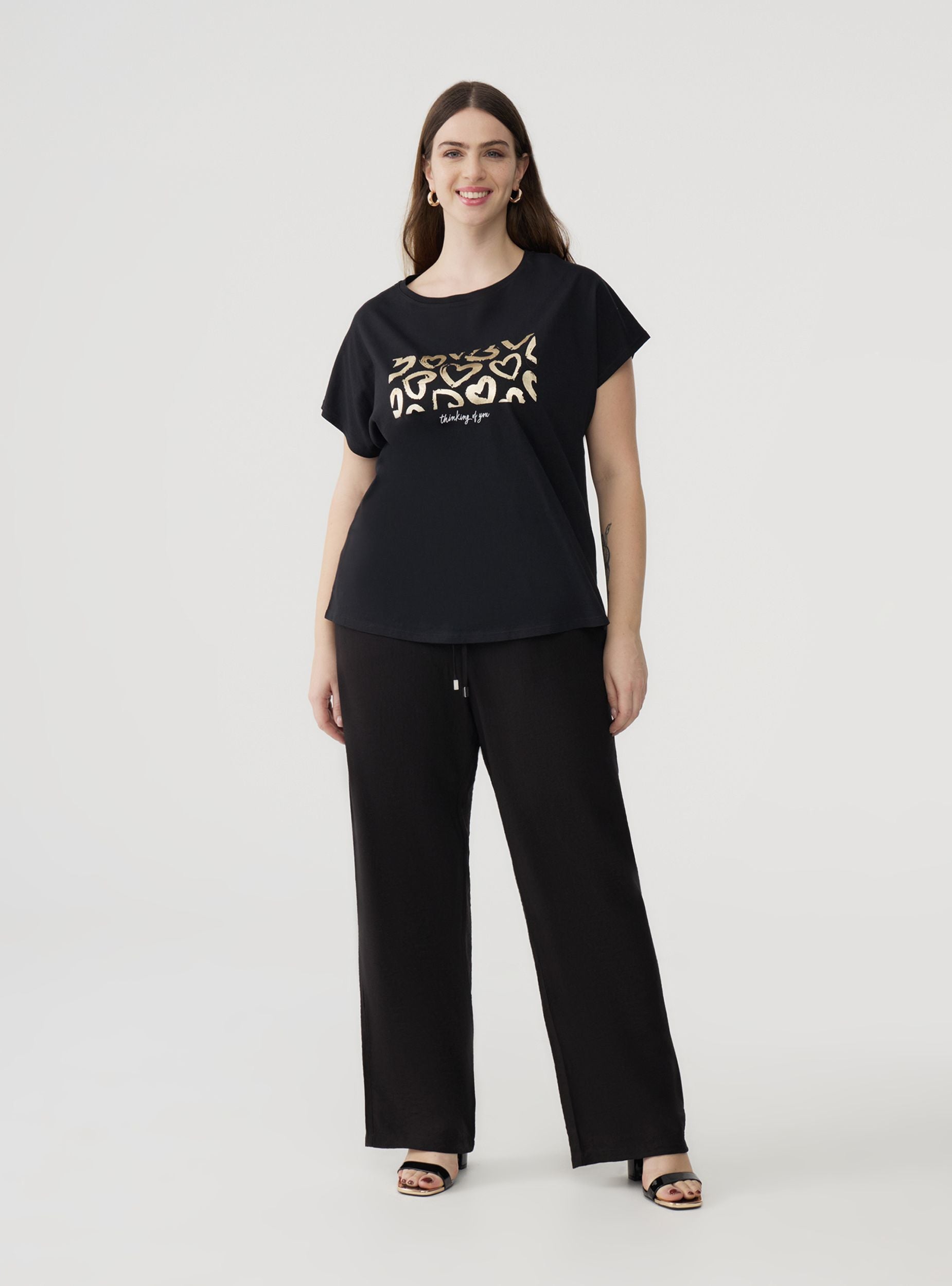 Maglietta da donna perfetta per un look casual e alla moda, ideale per le giornate informali o per aggiungere un tocco glamour agli outfit quotidiani. Caratterizzata da una stampa laminata con scritta che cattura l’attenzione, questa t-shirt con maniche corte e girocollo offre comfort e stile. Abbinala a jeans o pantaloni per un outfit versatile e moderno.Dettagli