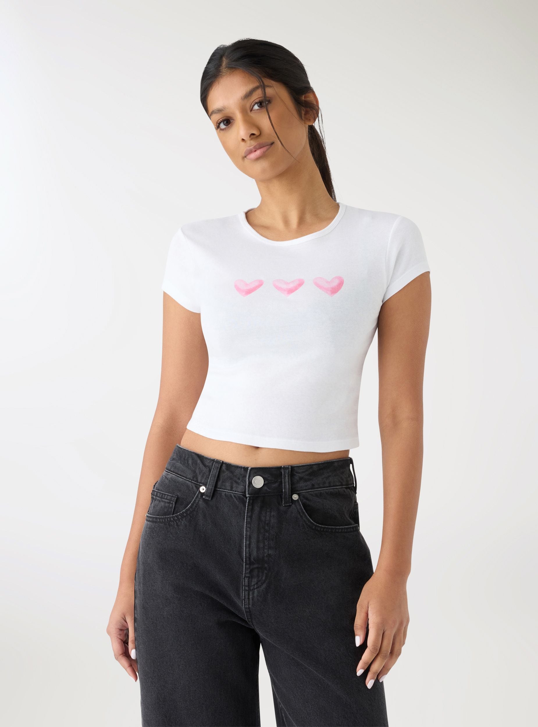 Maglietta da donna a maniche corte con vestibilità crop e scollo tondo. La grafica stampata al centro del petto aggiunge un tocco giocoso, perfetta per look casual con jeans a vita alta, minigonna o pantaloncini. Ideale per il tempo libero e le uscite di tutti i giorni, si indossa facilmente sotto una giacca leggera o una felpa.Dettagli
