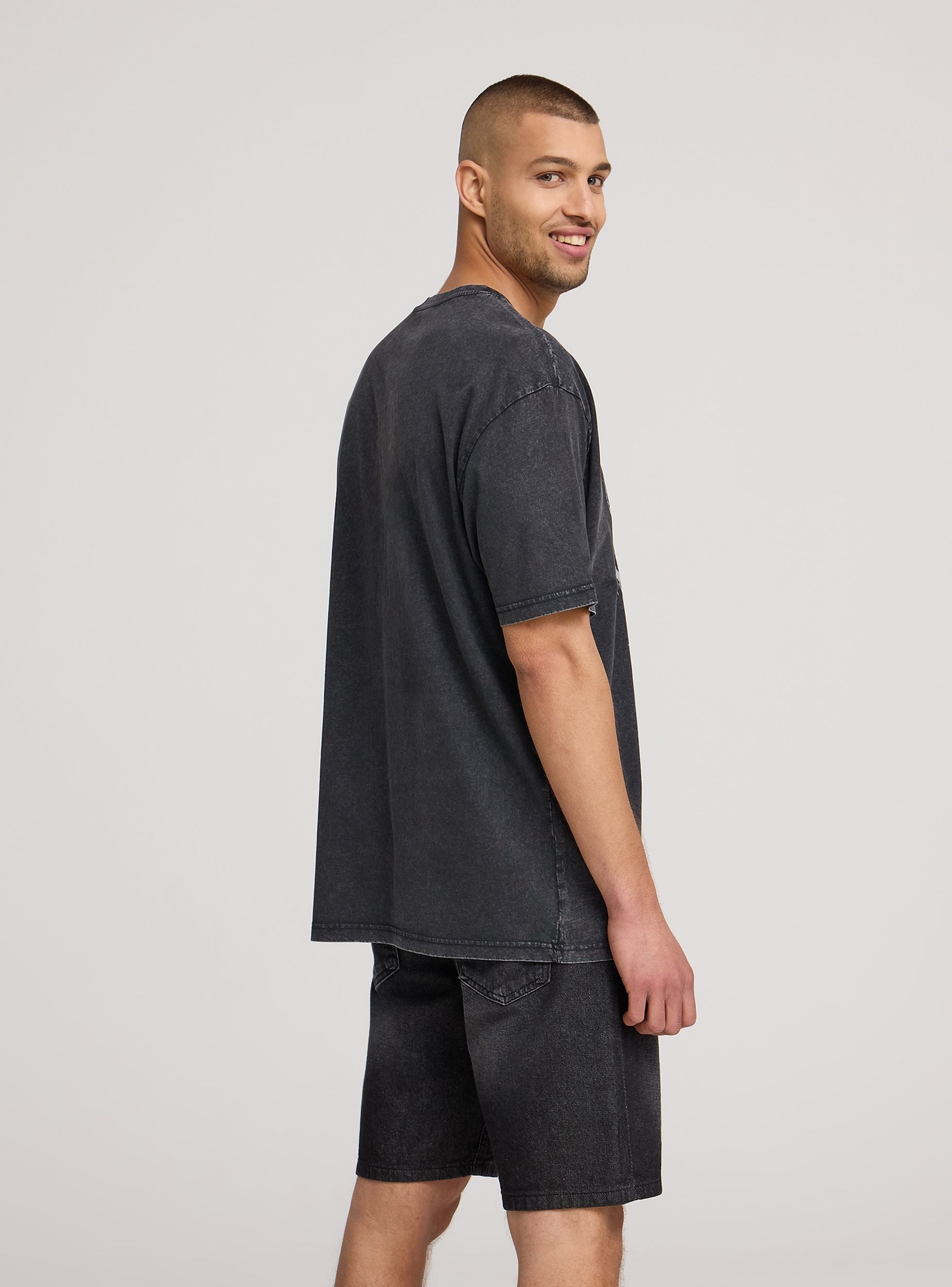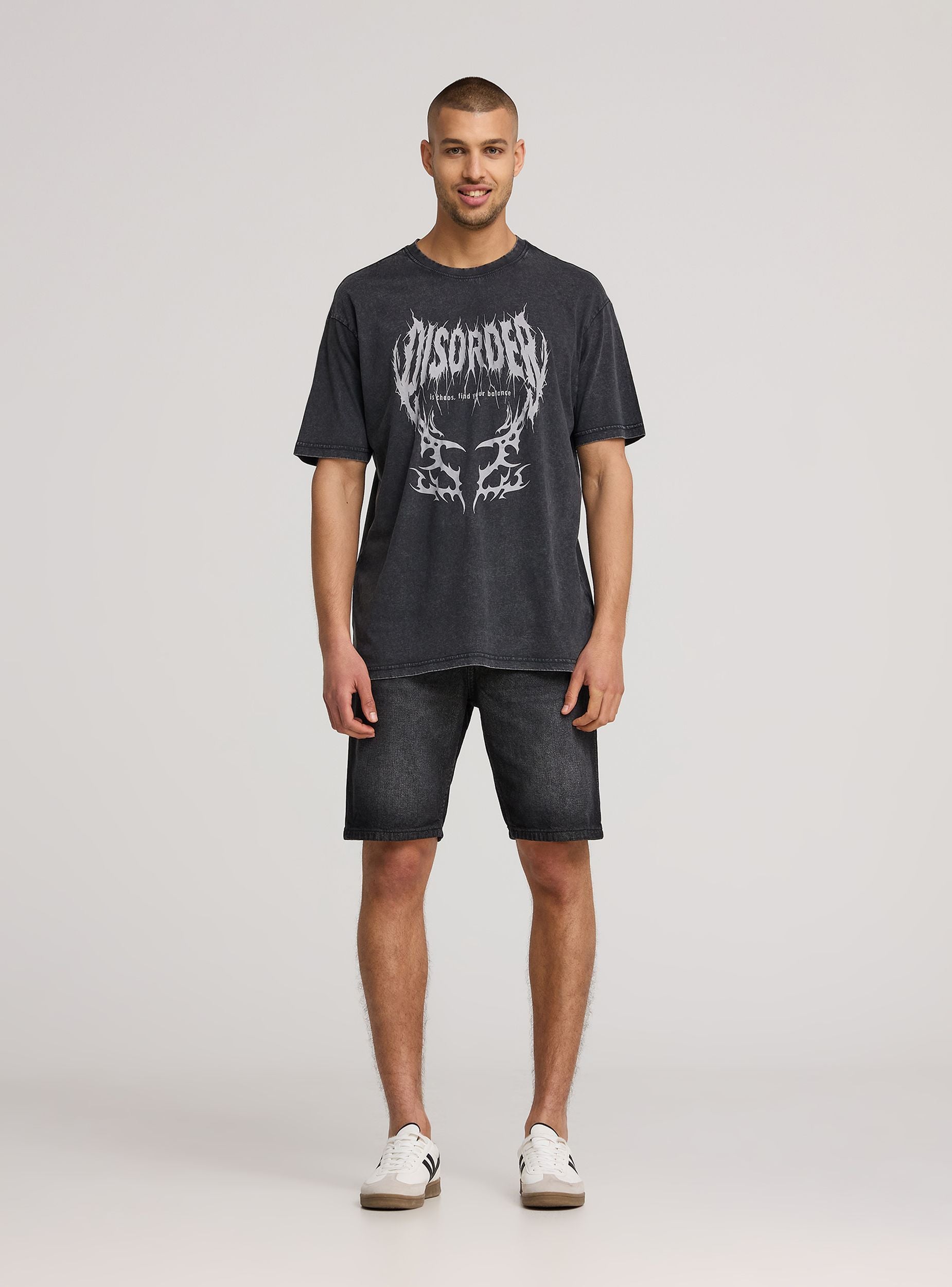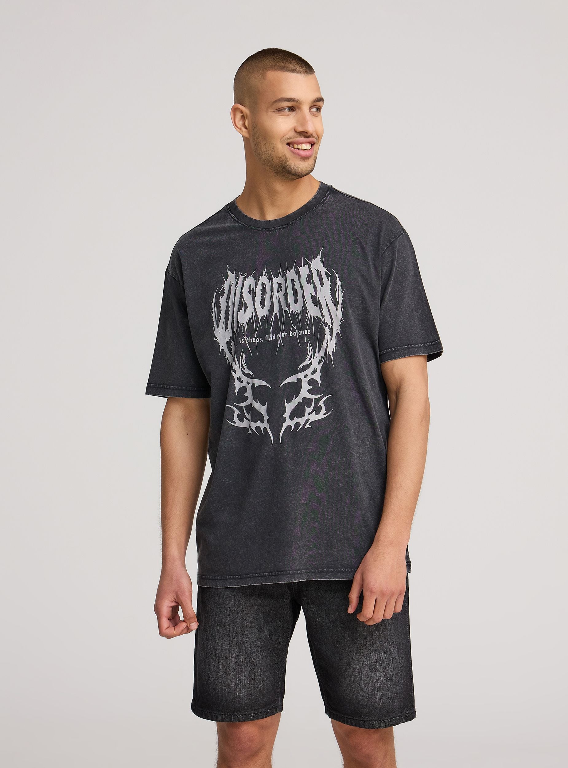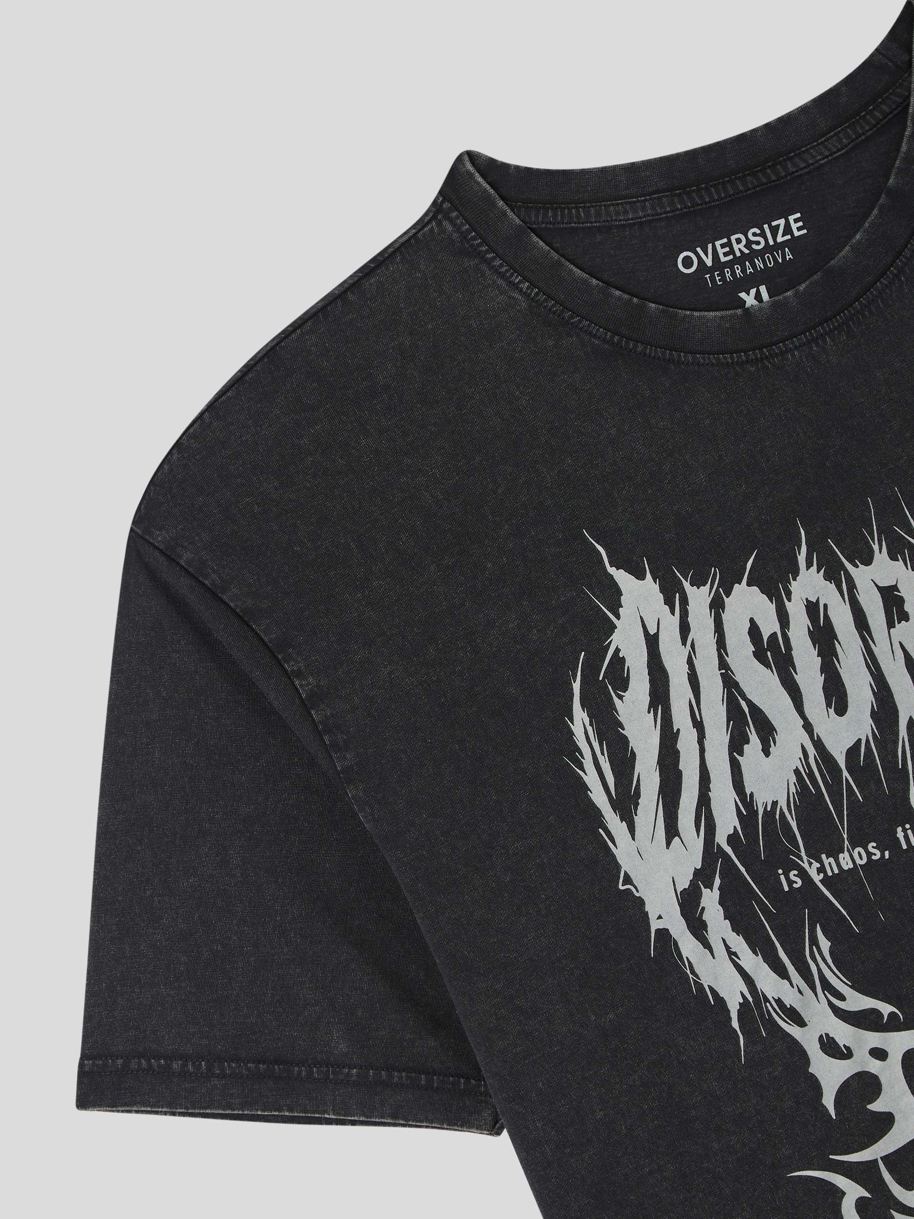 Maglietta da uomo con un design oversize e una stampa frontale dallo stile metal. Il modello girocollo presenta maniche corte, perfetto per un look casual e grintoso. La vestibilità ampia aggiunge un tocco moderno e rilassato, ideale per chi ama un abbigliamento comodo ma con carattere. La grafica audace sul petto conferisce un aspetto distintivo, richiamando le atmosfere del mondo musicale heavy metal.Dettagli