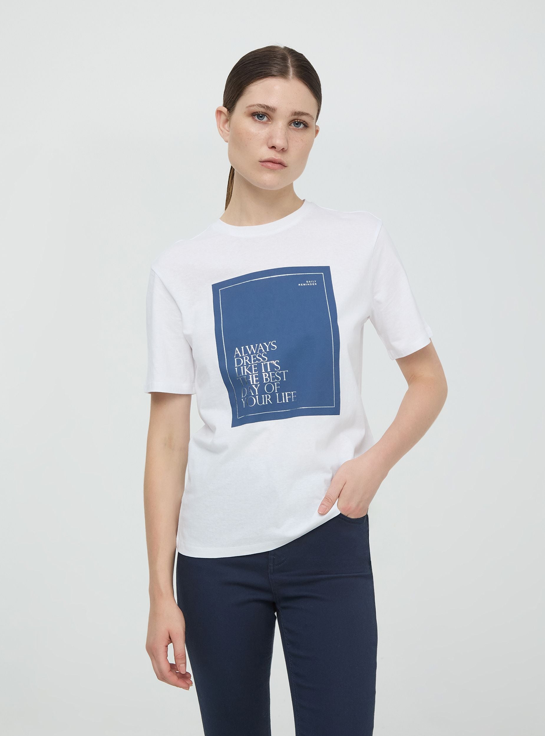 Maglietta da donna con scritta e stampa laminata. Modello girocollo, maniche corte. Vestibilità ampia.Dettagli