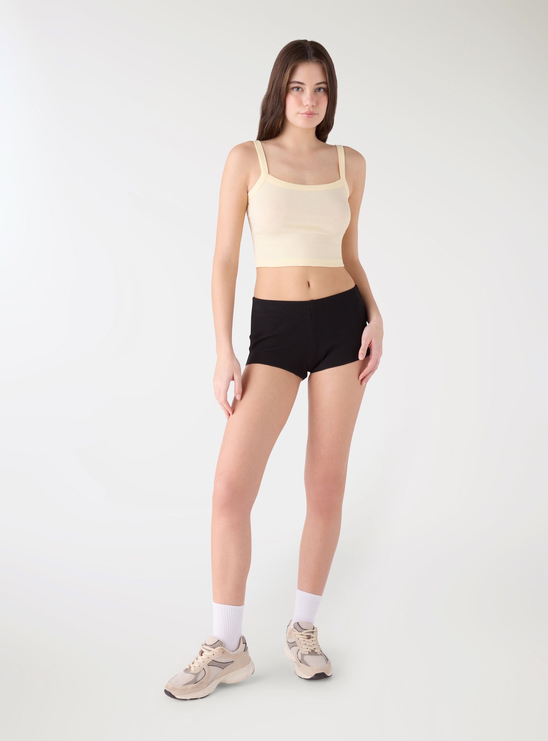 Canotta da donna con spalline sottili in tinta unita. Modello crop in maglia a costine che segue la figura senza costringere, ideale sotto camicie aperte, blazer o con pantaloncini e jeans a vita alta. Scollo dritto e bordi rifiniti, senza chiusure. Versatile per il tempo libero o per look a strati nelle mezze stagioni