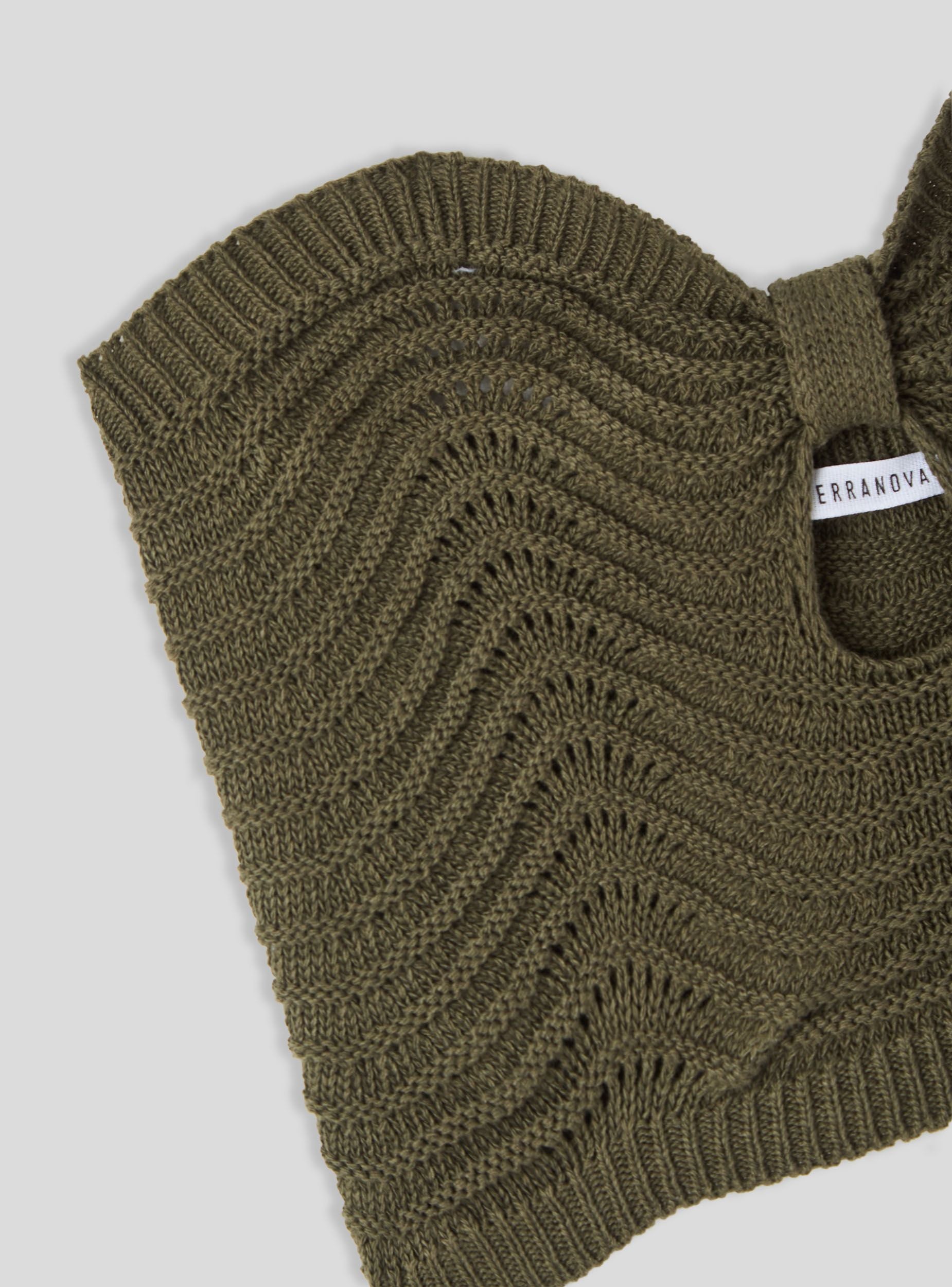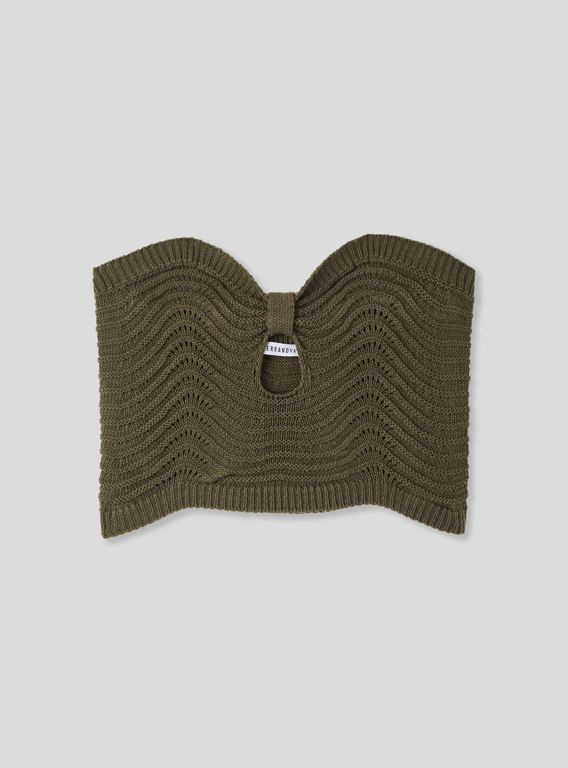 Top da donna a fascia, ideale per un look estivo e casual. La lavorazione a maglia crea un design unico e accattivante, perfetto per essere abbinato a pantaloni o gonne a vita alta. La vestibilità aderente valorizza la silhouette, mentre il design senza spalline offre un tocco moderno e versatile. Perfetto per occasioni informali o per completare un outfit da giorno.Dettagli