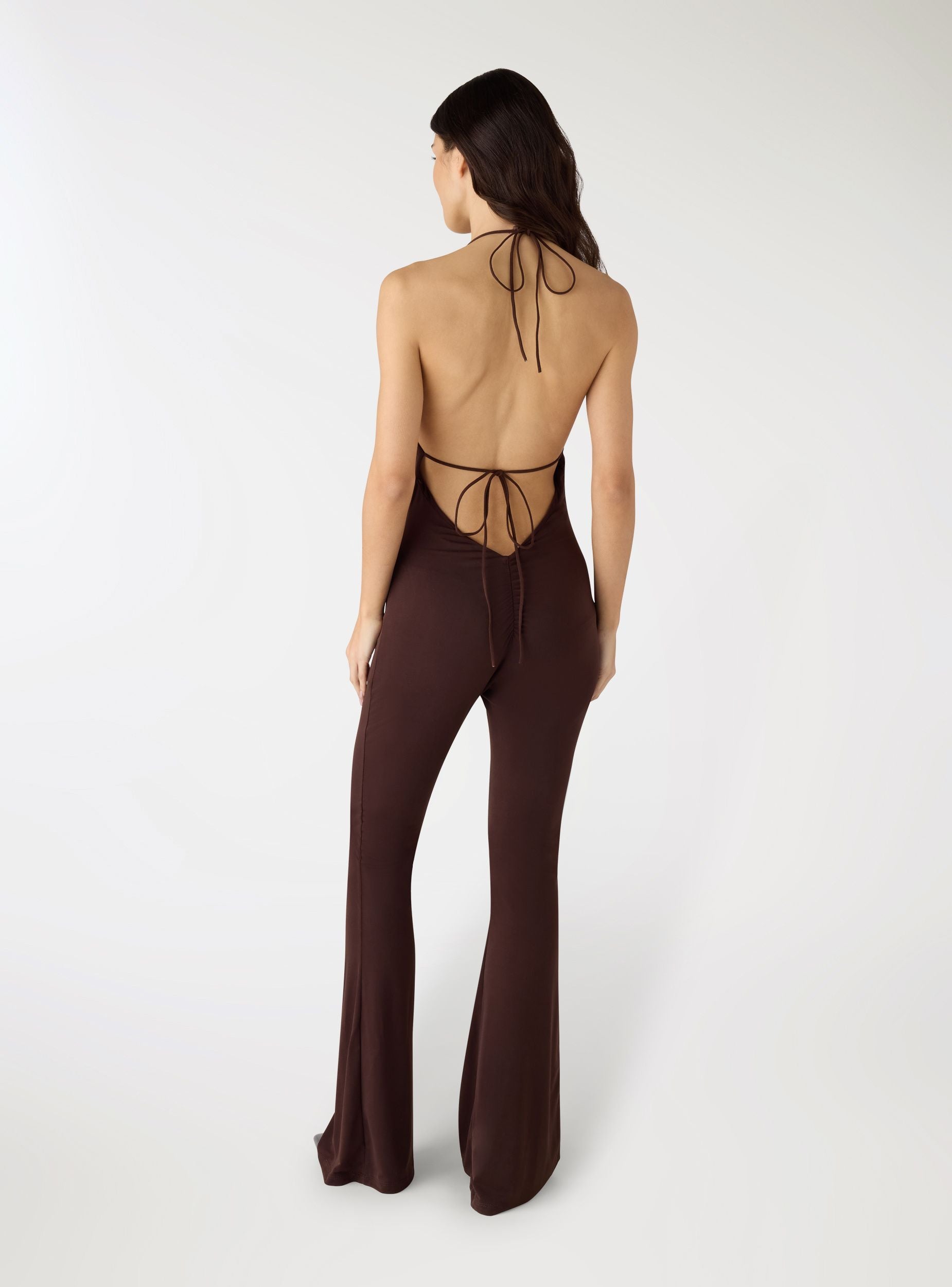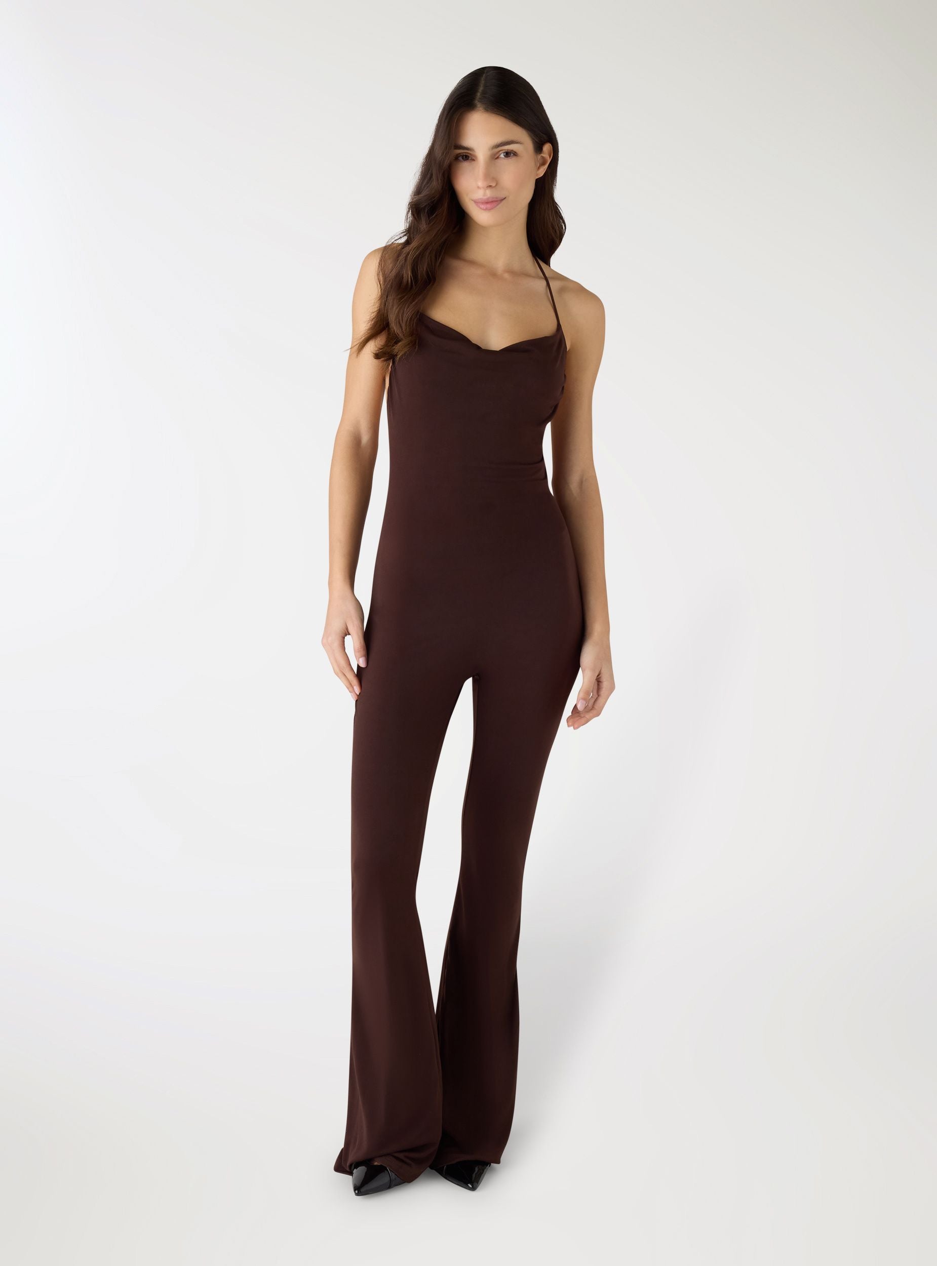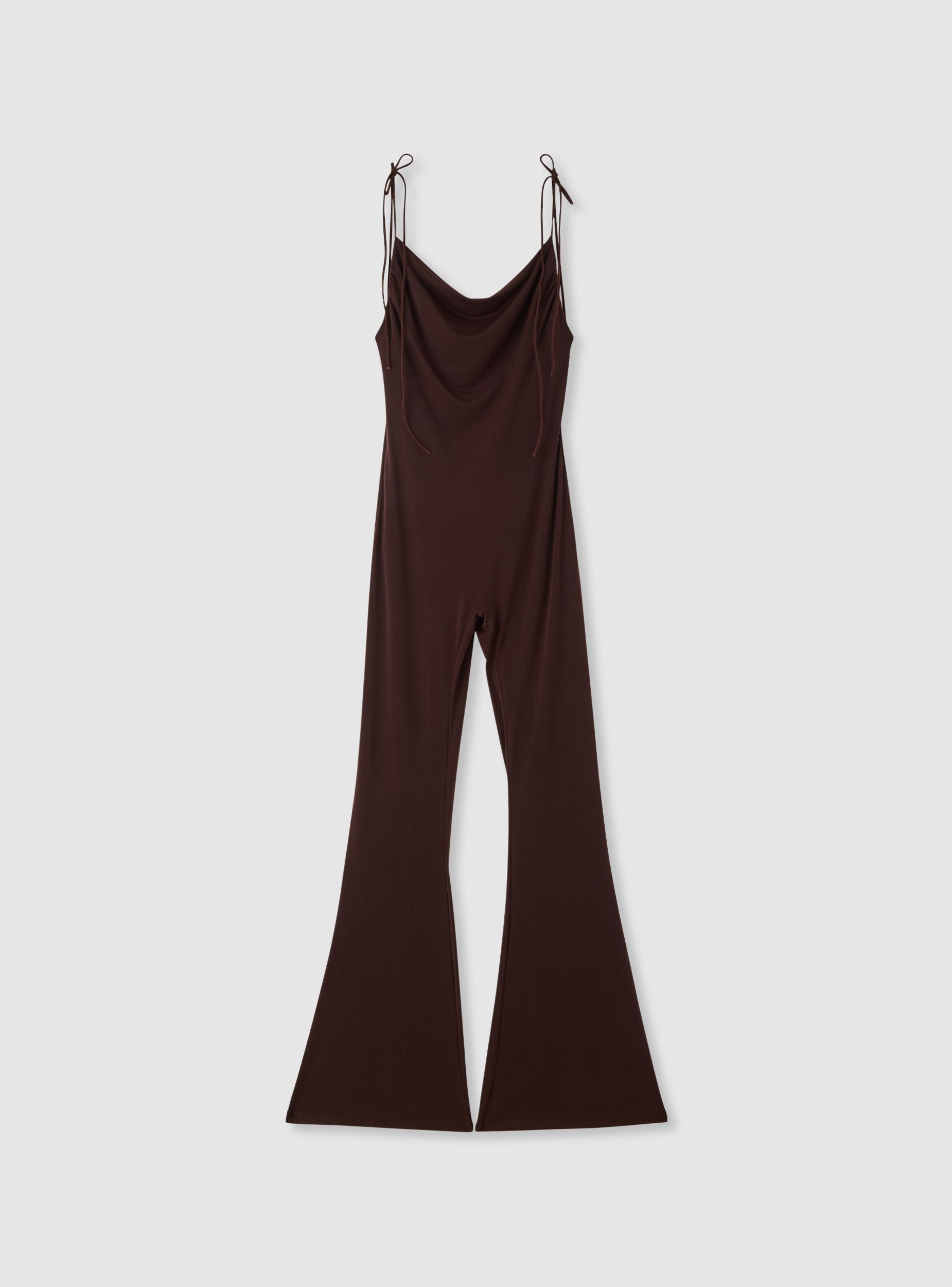 Tuta da donna a tinta unita pensata per look da sera e occasioni speciali. Il modello con spalline sottili regolabili a laccio e scollo morbido a cascata valorizza il décolleté, mentre l’arricciatura sul retro aggiunge movimento. Gamba lunga leggermente svasata, ideale con sandali o décolleté e una clutch essenziale.Dettagli