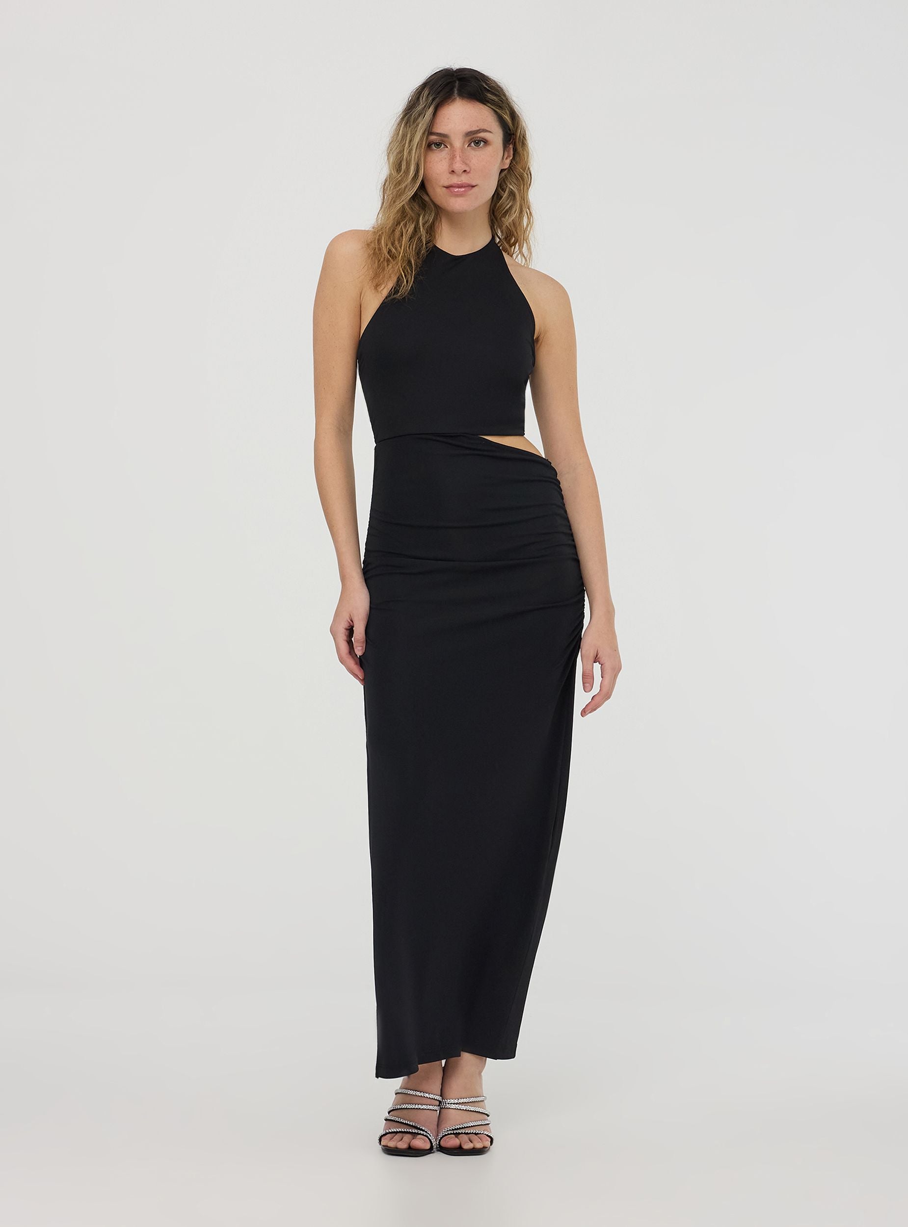 Abito da donna lungo a tinta unita, perfetto per chi cerca eleganza con un tocco di audacia. Il design presenta uno scollo all'americana che mette in risalto le spalle e dona un aspetto raffinato. La caratteristica cut-out aggiunge un elemento intrigante, lasciando scoperta una parte del busto e creando un effetto di seduzione discreta. Elasticizzato, questo abito avvolge le forme in modo naturale, garantendo comfort e libertà di movimento. Ideale per serate speciali o occasioni in cui si desidera un look sofisticato e contemporaneo.Dettagli