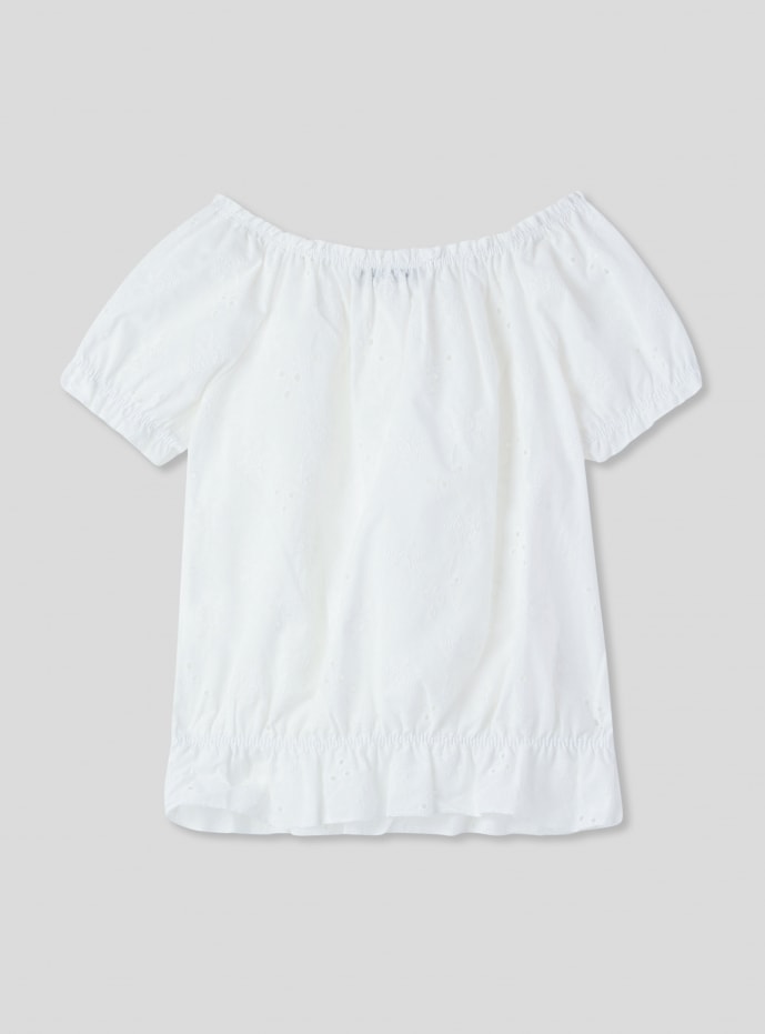 Blusa da bambina con maniche corte e design sangallo a tinta unita, ideale per un look casual e fresco. La vestibilità comoda e il tessuto leggero la rendono perfetta per giornate estive. Può essere abbinata a pantaloni o gonne per occasioni informali, aggiungendo un tocco di eleganza e femminilità.