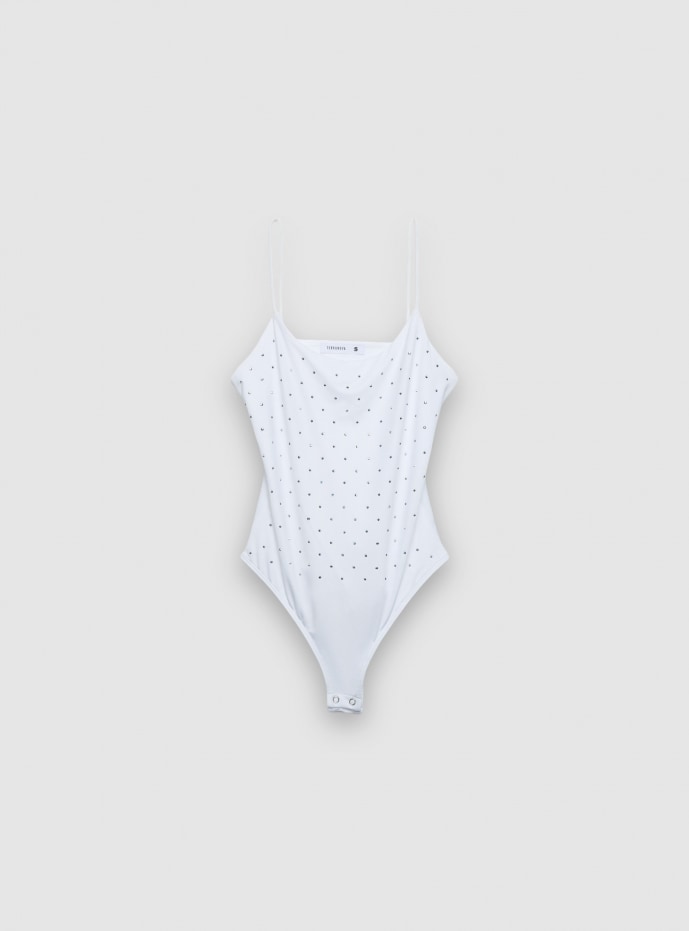 Body da donna a tinta unita con spalline sottili, impreziosito da applicazioni strass. Chiusura con bottoni a pressione al cavallo per una vestibilità pratica. Ideale sotto blazer o camicie per look serali o party, si abbina a jeans skinny o gonne midi. Linea aderente che valorizza la silhouette.