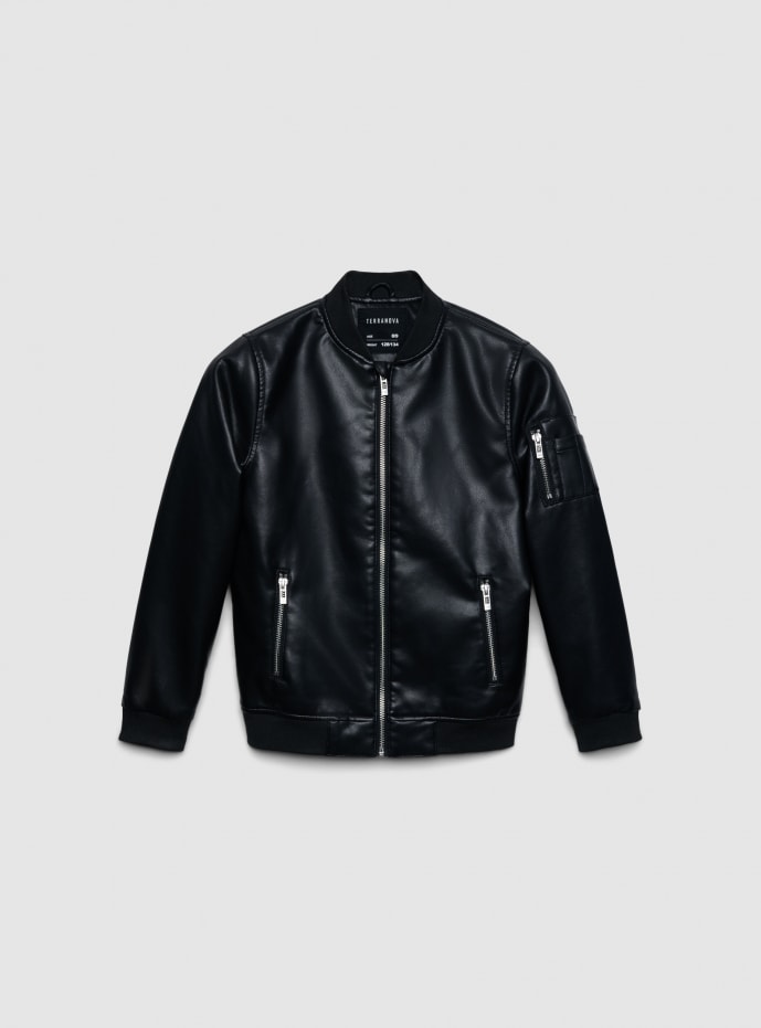 Giubbotto da bambino stile bomber in effetto pelle, perfetto per look urban e casual. Maniche lunghe e chiusura frontale con zip. Due tasche laterali con zip e taschino con zip sulla manica. Finiture a coste su polsi e fondo per una vestibilità confortevole. Ideale sopra felpe o magliette per la scuola e il tempo libero, si abbina a jeans o pantaloni cargo.