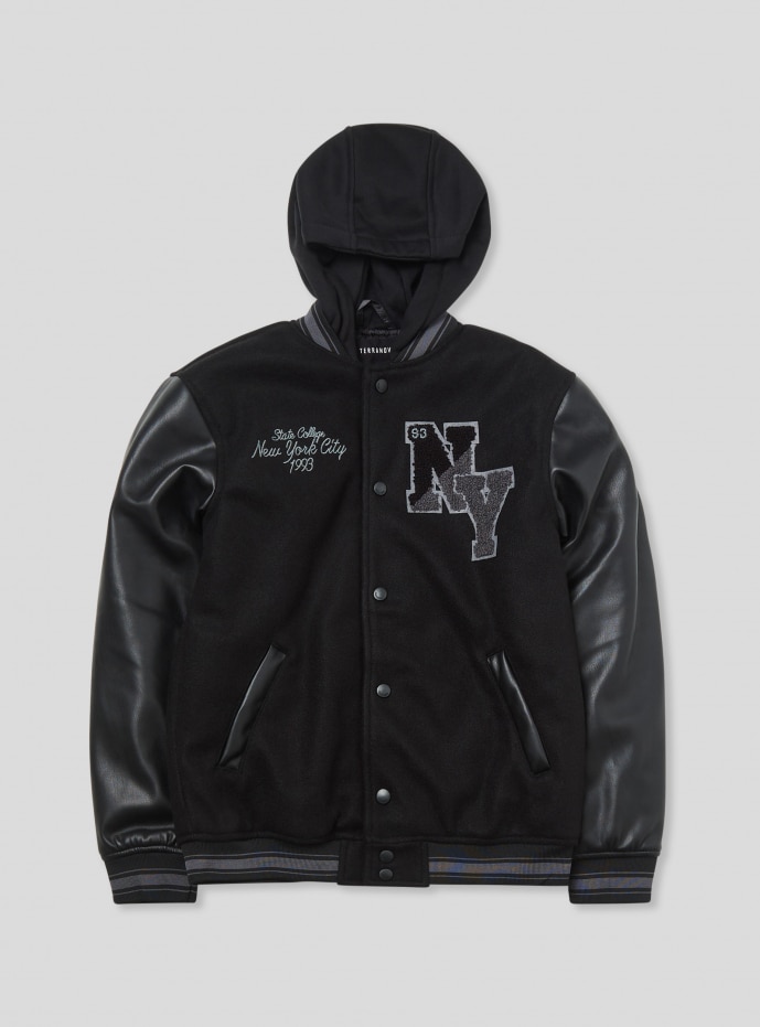 Bomber da bambino in stile college con cappuccio, presenta una scritta sul petto e un ricamo "New York" grande sulla schiena. Le maniche lunghe sono in effetto pelle. La chiusura è con bottoni a pressione e presenta due tasche frontali con bottoni a pressione. L'interno è foderato per un maggiore comfort.