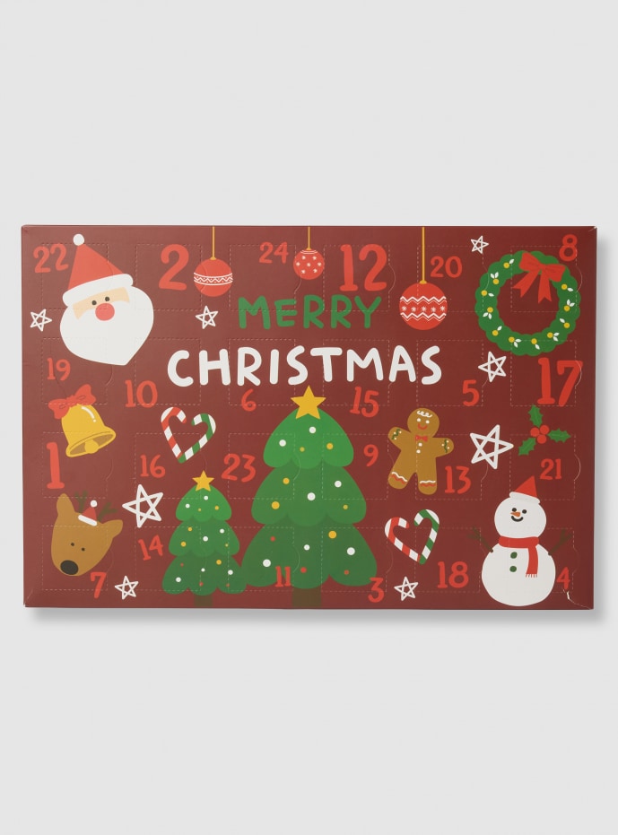 Calendario dell'Avvento da donna con 24 accessori decorativi. Calzini, slip, accessori per i capelli tutto a tema natalizio.