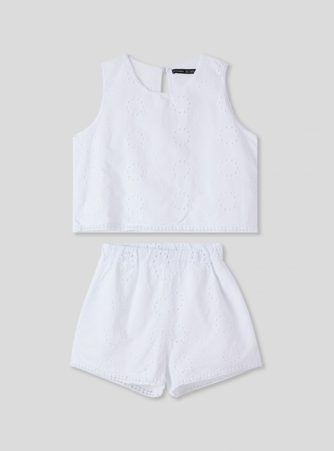 Completo da bambina composto da un top con design crop con chiusura con bottone sul retro e pantaloncini corti. Ideale per le giornate estive. Presenta un motivo sangallo a tinta unita che aggiunge un tocco di eleganza e freschezza.