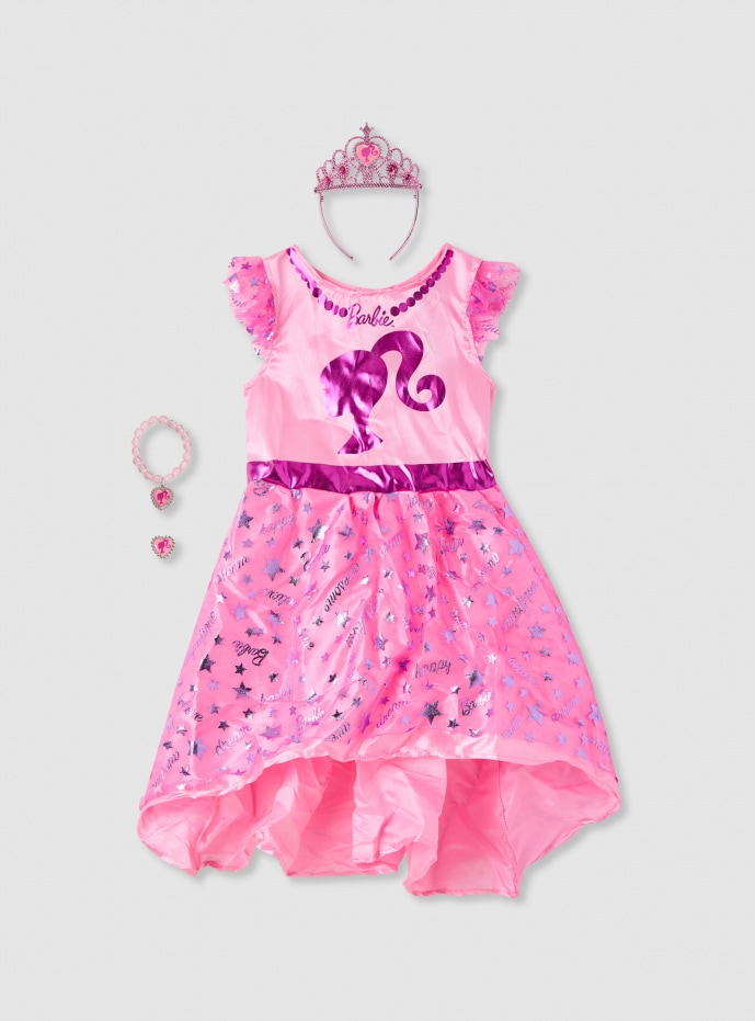 Costume da bambina per feste a tema, modello Barbie principessa. Smanicato con piccole ruches sulle spalle, scollo tondo e gonna svasata con strati leggeri decorati da stelle e scritte. Inclusi accessori coordinati come diadema, bracciale e anello per completare il look. Perfetto per compleanni, carnevale e giochi di ruolo