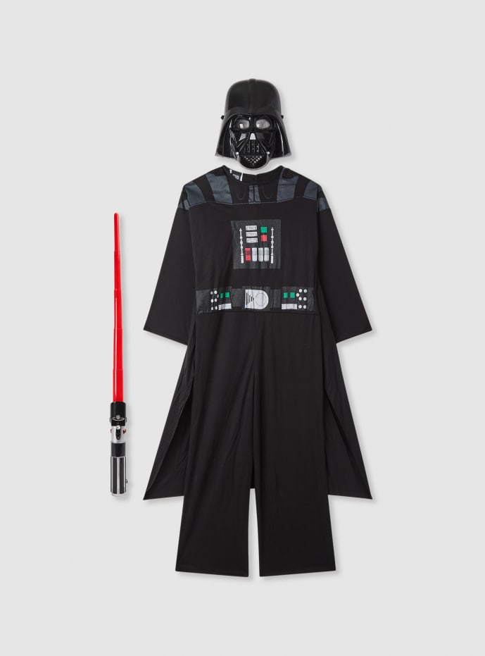 Costume da bambino di Darth Vader. Il set comprende tunica con maniche lunghe, mantello applicato, maschera rigida e spada luminosa giocattolo, ideale per feste in maschera, carnevale o party a tema.