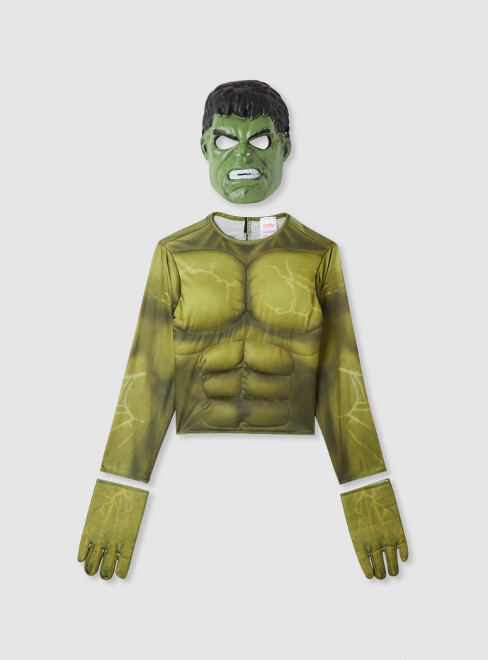 Costume di Hulk, ideale per feste in maschera. Maglietta a maniche lunghe con stampa muscolosa e scollo tondo. Inclusi maschera rigida e guanti coordinati per un effetto completo. Vestibilità regular pensata per il gioco e per interpretare il personaggio preferito.