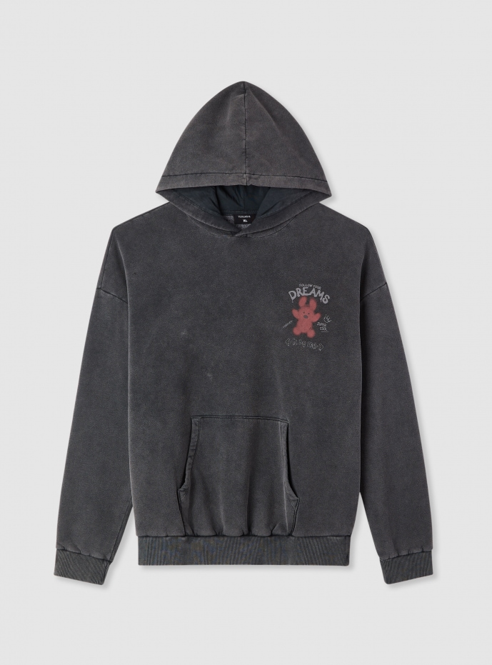 Felpa da uomo con cappuccio, senza zip e tasca a marsupio, finitura a tinta unita con stampa. Grafica con orsetto e scritte sul petto e sul retro che aggiunge carattere urbano. Bordo e polsini a coste per una vestibilità confortevole. Ideale per il tempo libero e outfit casual con jeans o pantaloni cargo. Tessuto pesante.