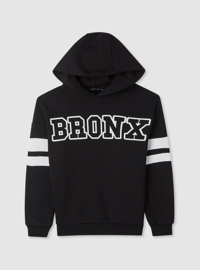 Felpa da bambino con cappuccio senza zip, ideale per la scuola e il tempo libero. Modello con maniche lunghe e vestibilità regular, caratterizzato da stampa sport frontale e sul retro. Polsini e fondo in maglia a costine per un fit confortevole, bande a contrasto sulle maniche. Facile da abbinare a jeans o pantaloni tuta per un look urbano e sportivo. Tessuto pesante.