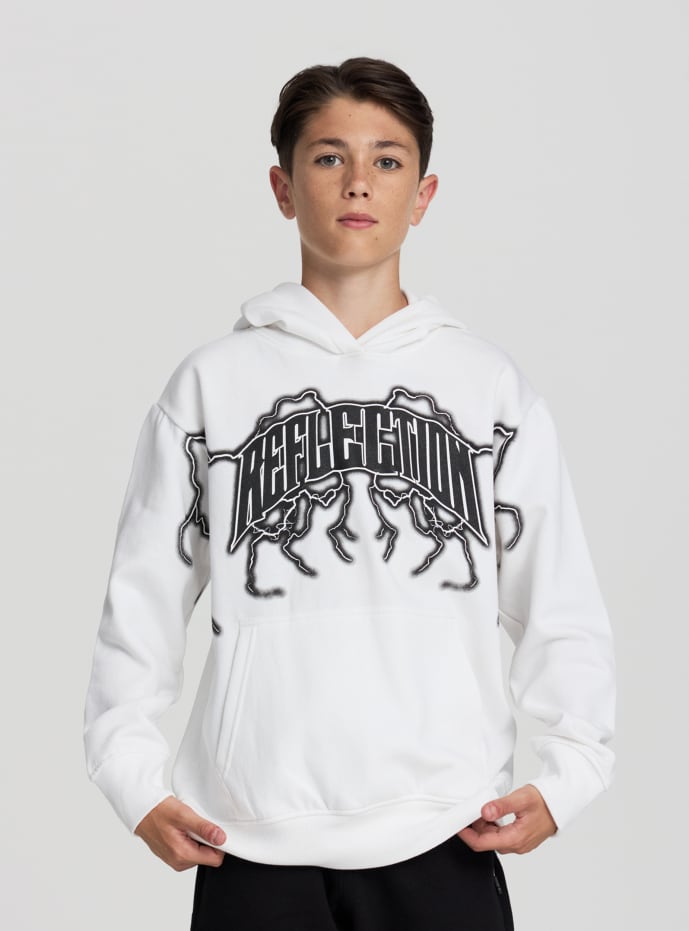 Felpa pesante da bambino con cappuccio, ideale per un look casual e dinamico. Presenta una stampa con scritta e fulmini sul davanti, perfetta per aggiungere un tocco grintoso agli outfit quotidiani. Il modello ha maniche lunghe, tasca a marsupio frontale e polsini. Vestibilità regolare, si abbina facilmente a jeans o pantaloni sportivi per la scuola e il tempo libero.