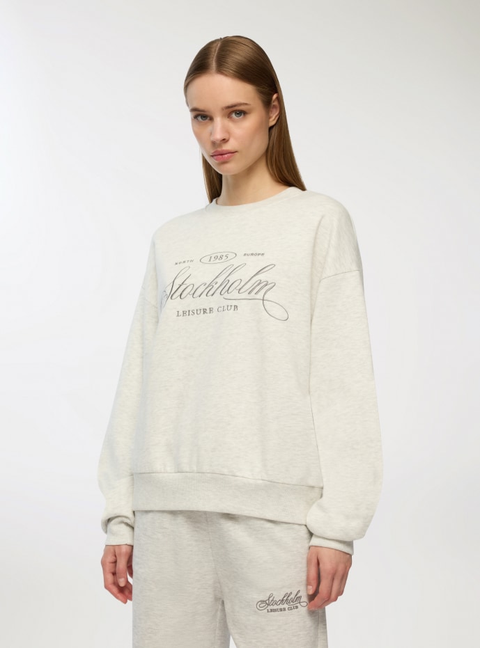 Felpa pesante da donna in stile college con scritta frontale “Stockholm” e altre scritte ricamate. Il fit ampio con spalle scese e fondo a costine garantisce comfort e libertà di movimento, ideale per uno stile casual e contemporaneo. Perfetta per l’inverno, si abbina facilmente a jeans, joggers o pantaloni cargo per creare outfit rilassati ma curati, adatti al tempo libero o alla città.