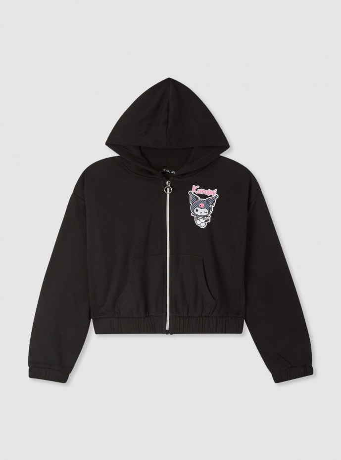 Felpa da bambina con cappuccio e con zip frontale, lunghezza crop e fondo arricciato elasticizzato. Presenta tasche a marsupio e stampa Kuromi® sul petto e sul retro, ideale per look casual e urban. Perfetta sopra maglietta e jeans o con pantaloni tuta per il tempo libero. Maniche lunghe con polsini elasticizzati e vestibilità comoda che assicura libertà di movimento.