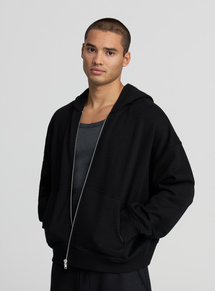 Felpa pesante da uomo con cappuccio, ideale per un look casual e versatile. Modello crop con zip frontale, perfetta per essere indossata sopra t-shirt o camicie nelle giornate più fresche. Presenta tasche a marsupio e maniche lunghe, offrendo comfort e praticità. Vestibilità cropped che valorizza outfit streetwear e abbinamenti con jeans o pantaloni sportivi. Design a tinta unita, adatta a diverse occasioni informali.
