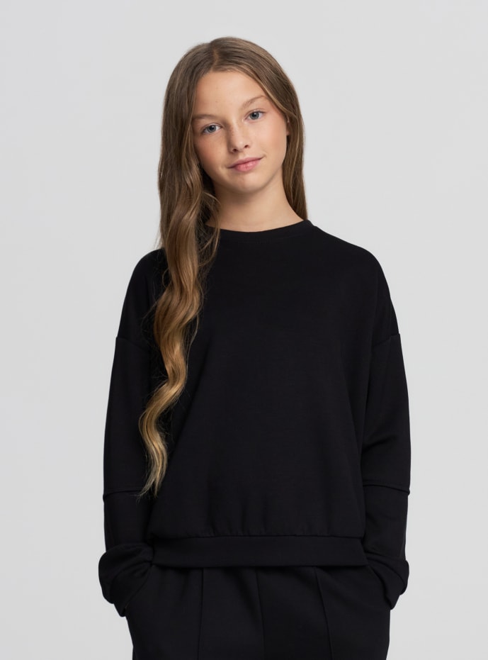Felpa da bambina in tinta unita con girocollo e maniche lunghe. Modello senza cappuccio e senza zip, dal taglio regolare con spalle leggermente scese, polsini e fondo con bordi elasticizzati per maggiore comfort. Perfetta per la scuola e il tempo libero, si abbina facilmente a jeans, leggings per look casual. Tessuto pesante.