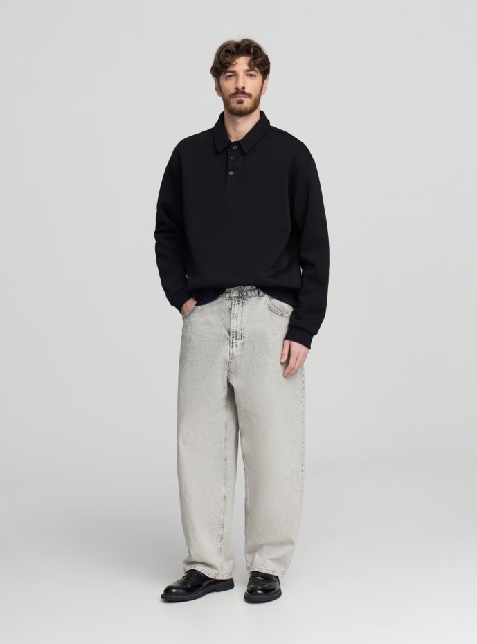 Felpa da uomo a tinta unita con collo polo e abbottonatura a tre bottoni, ideale per look casual e urban. Maniche lunghe con polsini e fondo lavorati a coste per una vestibilità confortevole. Modello senza zip e senza cappuccio, perfetto da indossare con jeans o chino per il tempo libero o l’ufficio informale. Tessuto pesante che assicura calore nelle giornate più fresche.