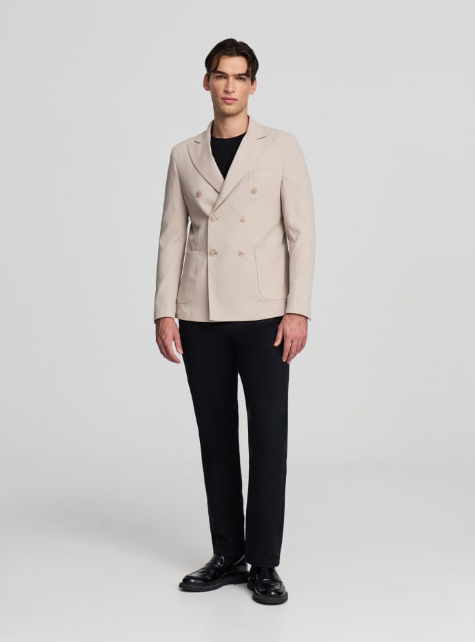 Giacca da uomo a tinta unita con linea regular e doppio petto. Revers a lancia e taschino sul petto, tasche inferiori a toppa e chiusura a bottoni. Perfetta per cerimonie, ufficio o occasioni eleganti, si abbina a camicia e pantaloni sartoriali o a maglietta e chino per un look urbano raffinato. Collo strutturato, maniche lunghe e design pulito, ideale per valorizzare outfit formali e casual.