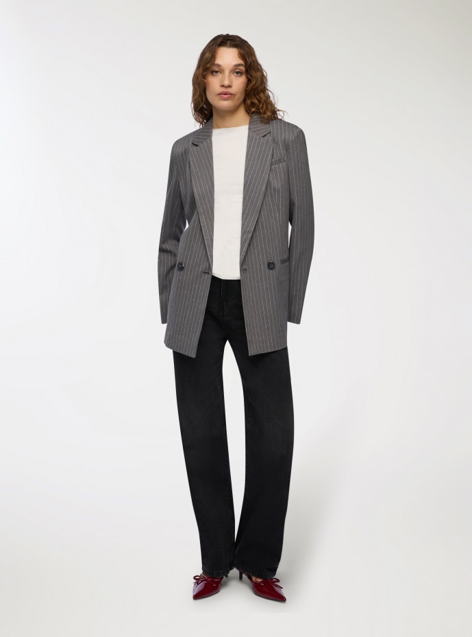 Giacca da donna doppiopetto con fantasia gessata. Ideale per occasioni formali e professionali, questa giacca presenta una chiusura a due bottoni e un design elegante. Perfetta da abbinare a pantaloni classici o gonne per un look sofisticato. La vestibilità regolare e il taglio strutturato garantiscono comfort e stile.