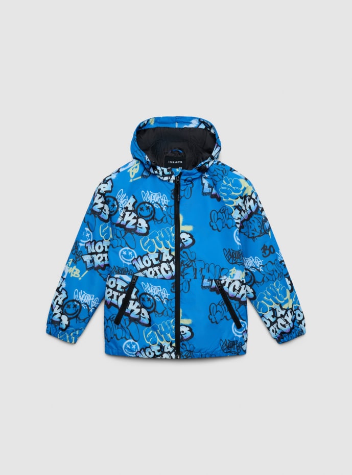 Giubbino da bambino con cappuccio, perfetto per la mezza stagione e per la scuola. Modello con zip frontale e polsini elasticizzati per una vestibilità confortevole. Presenta tasche laterali con zip. Design a stampa con graffiti, facile da abbinare a felpe e jeans per look casual e dinamici.