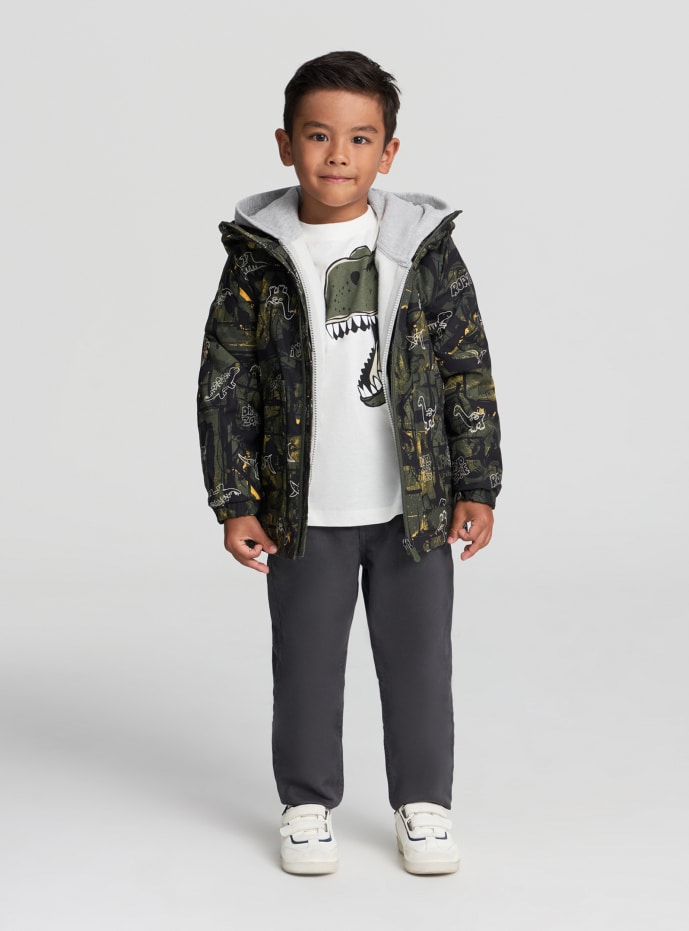 Giubbotto da bimbo con cappuccio, ideale per le giornate casual. Dotato di una chiusura con zip, questo capo presenta una stampa vivace a tema dinosauri che lo rende unico e divertente. Perfetto per proteggere dal vento e dalla pioggia, offre un design pratico con tasche funzionali e polsini elasticizzati. Un'opzione versatile per completare outfit comodi e alla moda.