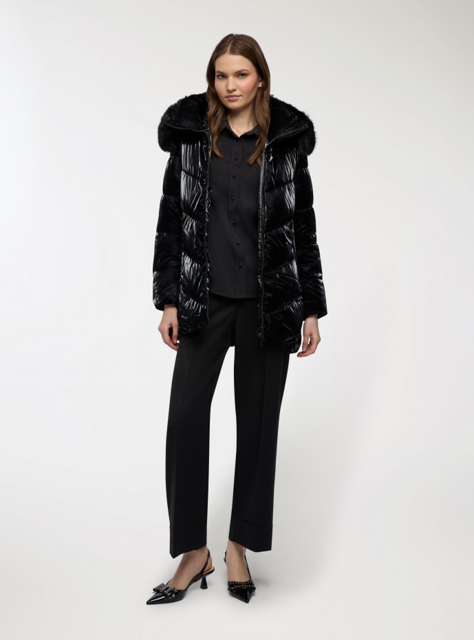 Giubbotto imbottito da donna, tinta unita, con cappuccio avvolgente rifinito da bordo peloso. Chiusura frontale con zip e tasche laterali, trapuntatura diagonale che slancia la figura. Lunghezza media adatta a look quotidiani in città e momenti di tempo libero. Perfetto su maglione e jeans o con stivali e pantaloni per un outfit caldo e femminile.