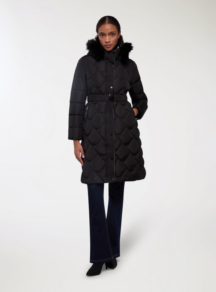 Giubbotto lungo imbottito da donna. Modello con cappuccio bordato di pelliccia sintetica e cintura in vita con fibbia, ideale per le giornate fredde in città o nel tempo libero. Tessuto trapuntato a rombi, chiusura frontale con zip coperta da pattina a bottoni automatici e tasche laterali. Vestibilità regular che valorizza la silhouette, perfetto su jeans e stivali.