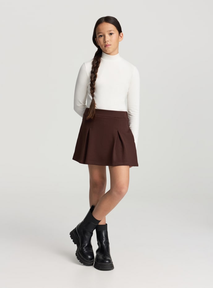 Gonna da bambina a tinta unita con pieghe frontali e fascia in vita elasticizzata, pensata per scuola e tempo libero. Lunghezza mini e linea svasata che facilita il movimento. Si abbina a maglietta e cardigan o a felpa per look casual. Dettagli puliti e cuciture visibili sull’orlo valorizzano il design essenziale.