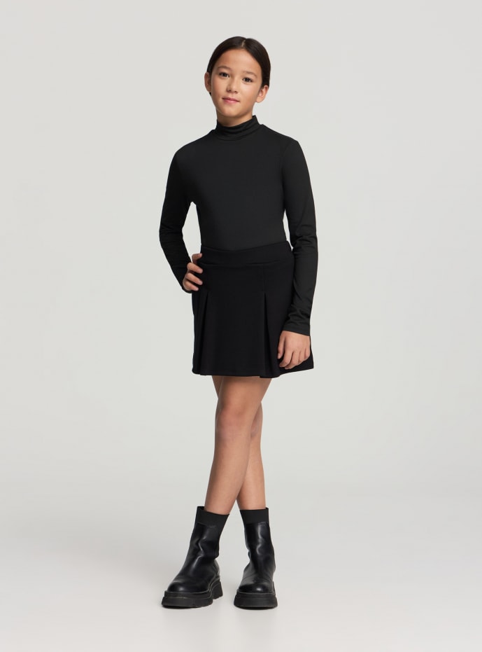 Gonna da bambina a tinta unita con pieghe frontali e fascia in vita elasticizzata, pensata per scuola e tempo libero. Lunghezza mini e linea svasata che facilita il movimento. Si abbina a maglietta e cardigan o a felpa per look casual. Dettagli puliti e cuciture visibili sull’orlo valorizzano il design essenziale.