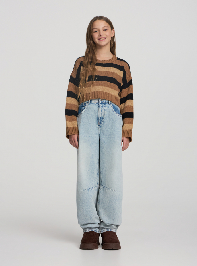 Jeans da bambina a tinta unita con vestibilità ampia ispirata al modello balloon. Chiusura con bottone e zip, passanti in vita e cinque tasche per praticità quotidiana. Lunghezza lunga alla caviglia, ideale con maglietta e sneakers per la scuola o il tempo libero. Lavaggio chiaro con dettagli evidenziati su cintura e tasche dona un look trendy e facile da abbinare.