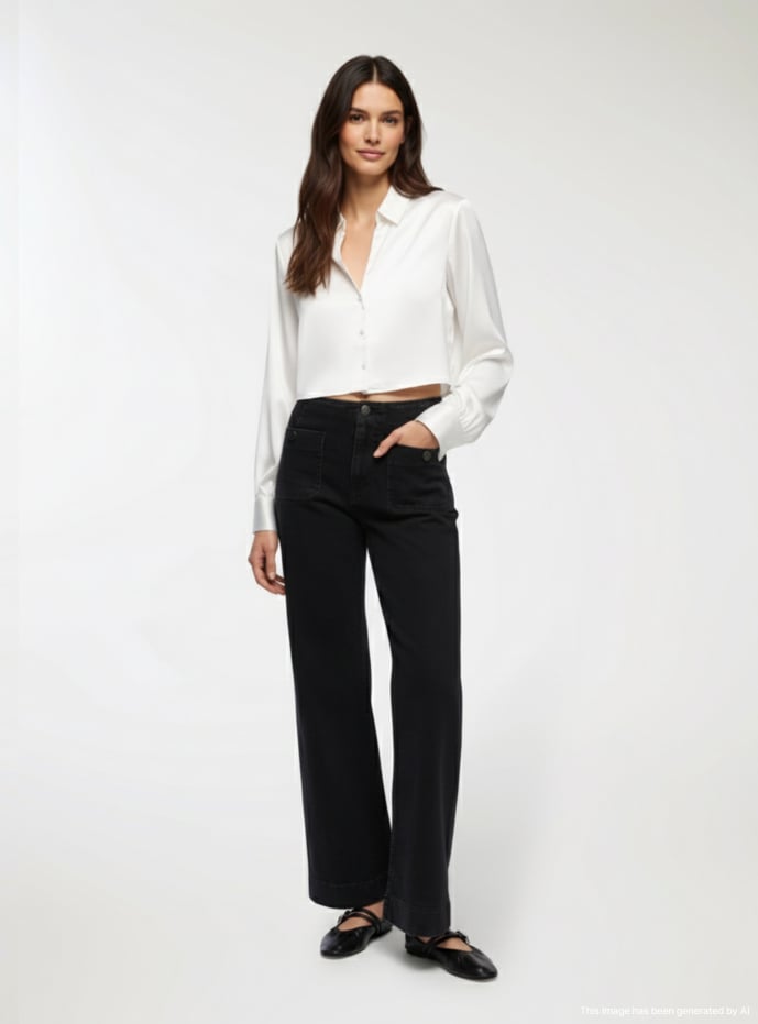 Jeans da donna con design a gamba larga e vestibilità ampia. Dotati di tasche applicate sul davanti con chiusura a bottone, offrono un look casual e moderno. Ideali per abbinamenti con magliette o camicie, perfetti per un outfit versatile adatto a diverse occasioni. La chiusura con bottone aggiunge un tocco di stile e praticità.