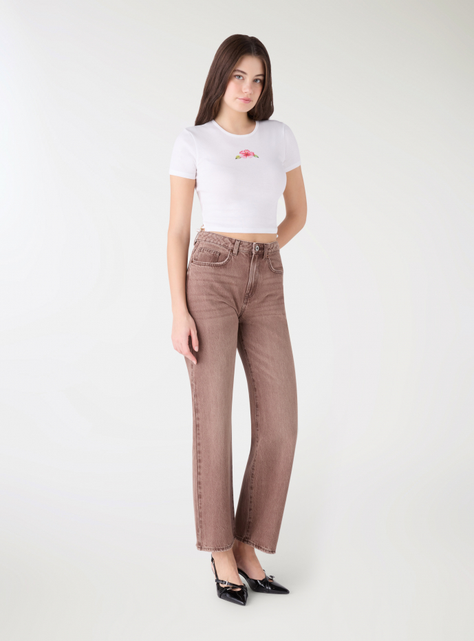 Jeans da donna a tinta unita con linea straight e gamba lunga. Vita media con passanti e chiusura con bottone e zip, ideale per look quotidiani urban. Cinque tasche con taschino frontale e tasche posteriori applicate. Lavaggio medio con effetto vissuto che valorizza il design. Versatili con maglietta e sneakers o con camicia e blazer per un tocco casual curato.