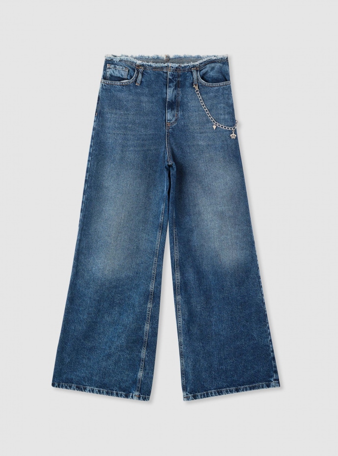 Jeans da donna a tinta unita con gamba ampia e vita sfrangiata. Modello lungo, perfetto per look casual o urban. Chiusura con bottone e zip, passanti per cintura e cinque tasche pratiche. Lavaggio medio con leggere sfumature. Il dettaglio catena aggiunge carattere e si abbina a maglietta e sneakers o a camicia e stivaletti per outfit versatili.