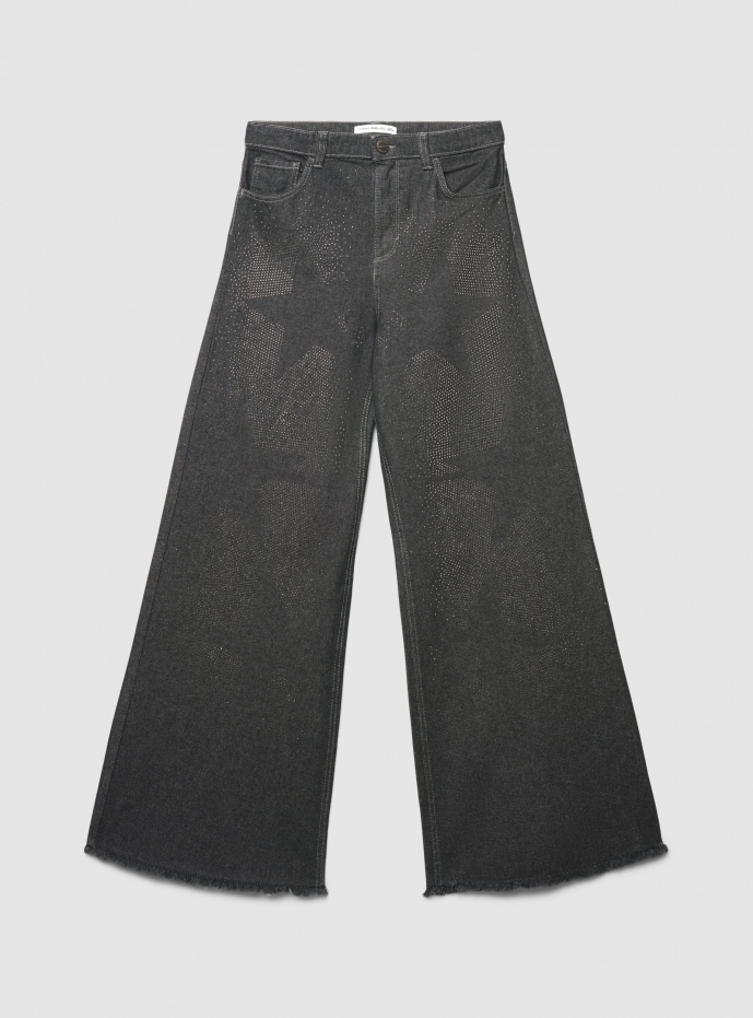 Jeans da bambina a gamba ampia con applicazioni di strass a forma di stelle, ideale per look casual e trendy. Modello lungo con vita media, chiusura con bottone e zip e passanti per cintura. Cinque tasche funzionali. Perfetti con maglietta e sneakers per la scuola o il tempo libero, si abbinano anche a felpa con cappuccio per uno stile urban.