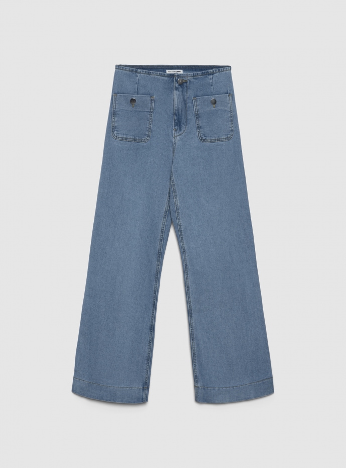Jeans da donna a tinta unita con linea wide leg e lunghezza alla caviglia. Vita media, chiusura con bottone e zip frontale. Davanti presenta tasche a toppa con patta e bottone per un tocco utility. Perfetti con una maglietta e sneakers per il giorno libero, si abbinano anche a camicie e sandali per un look casual curato. Fit regolare e gamba ampia per comfort e movimento.