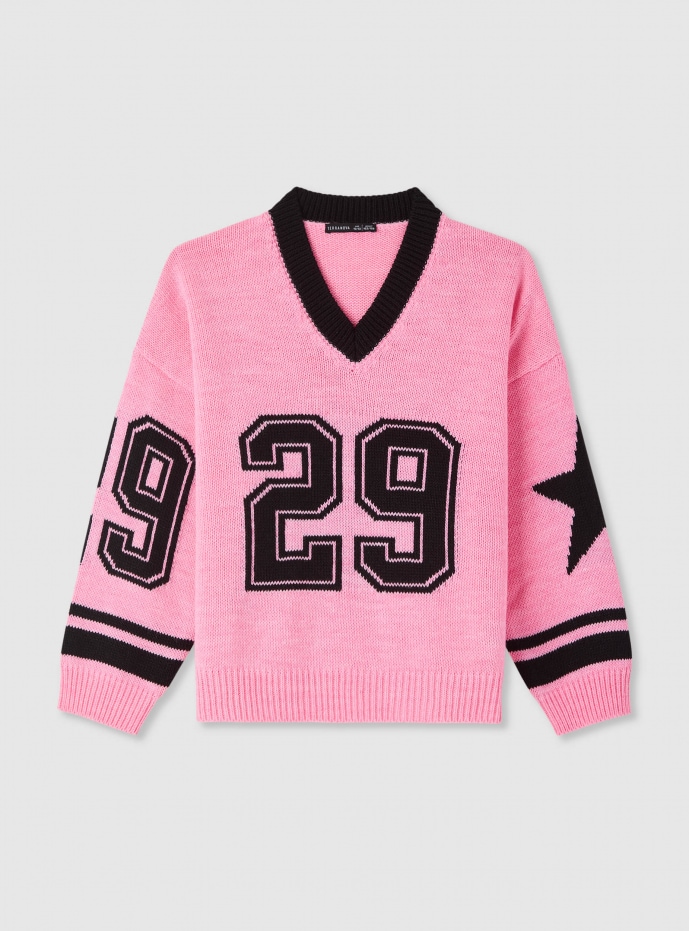 Maglia con scollo a V e stampa college Rosa