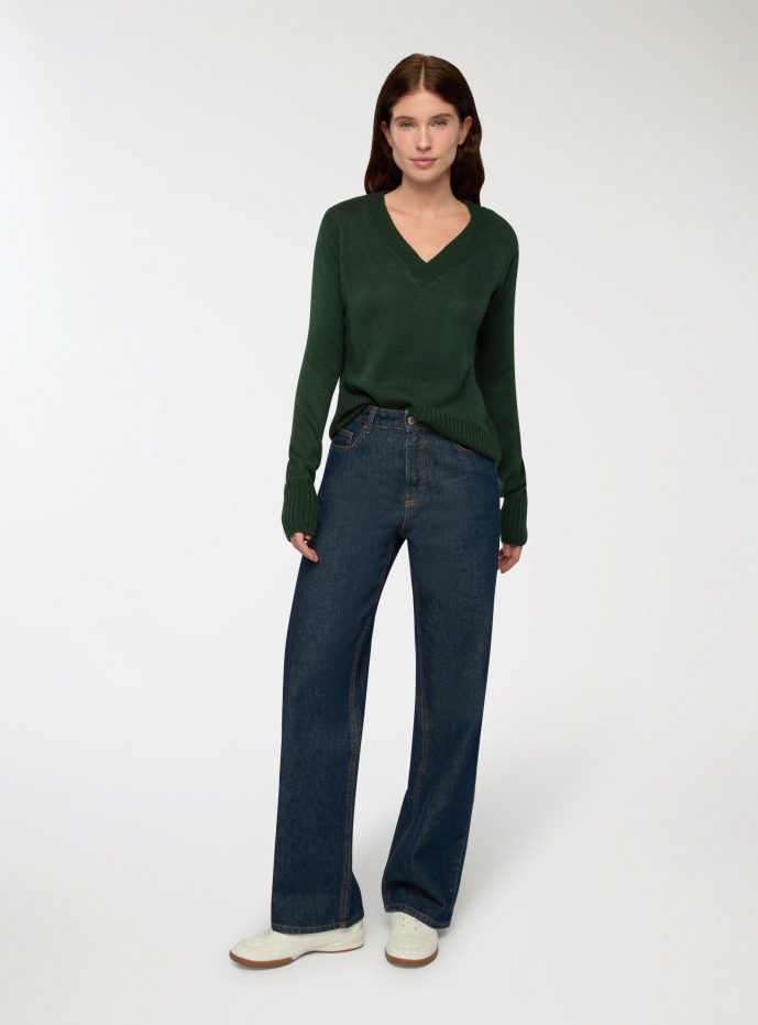 Maglia da donna con scollo a V e maniche lunghe, ideale per un look casual e versatile. Presenta polsini e bordo inferiore a coste che aggiungono un tocco di stile al design semplice. Perfetta per essere abbinata a jeans o gonne per un outfit quotidiano. La vestibilità comoda la rende adatta a diverse occasioni, dal lavoro al tempo libero.